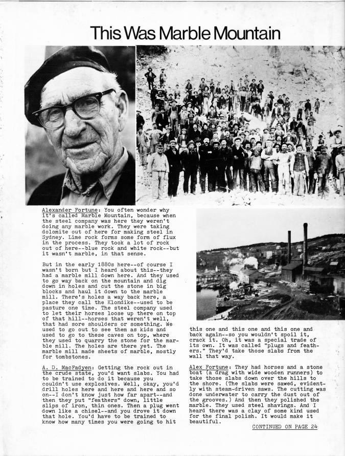 Published by Ronald Caplan on 1979/6/1 (217 reads)This V' Marble Mountain Alexander Fortune: You often wonder why it's called Marble Mountain, because when the steel company was here they weren't doing any marble work. They were taking dolomite out of here for making steel in Sydney. Lime rock forms some form of flux in the process. They took a lot of rock out of here--blue rock and white rock • but it wasn't marble, in that sense. But in the early l880s here • of course I wasn't born but I heard about this--they had a marble mill down here. And they used to go way back on the mountain and dig down in holes and cut the stone in big blocks and haul it down to the marble mill. There's holes a way back here, a place they call the Klondike--used to be pasture one time. The steel company used to let their horses loose up there on top of that hill • horses that weren't well, that had sore shoulders or something. We used to go out to see them as kids and used to go to these caves on top, where they used to quarry the stone for the mar? ble mill. The holes are there yet. The marble mill made sheets of marble, mostly for tombstones. A. D. MacFadyen: Getting the rock out in the crude state, you'd want slabs. You had to be trained to do it because you couldn't use explosives. Well, okay, you'd drill holes here and here and here and so on • I don't know just how far apart • and then they put "feathers" down, little slips of iron, thin ones. Then a plug went down like a chisel • and you drove it down that hole. You'd have to be trained to know how many times you were going to hit this one and this one and this one and back again--so you wouldn't spoil it, crack it. Oh, it was a special trade of its own. It was called "plugs and feath? ers." They'd take those slabs from the wall that way. Alex Fortune: They had horses and a stone boat (a drag with wide wooden runners) to take those slabs down over the hills to the shore. (The slabs were sawed, evident? ly with steam-driven saws. The cutting was done underwater to carry the dust out of the grooves.) And then they polished the marble. They used steel shavings. And I heard there was a clay of some kind used for the final polish. It would make it beautiful.