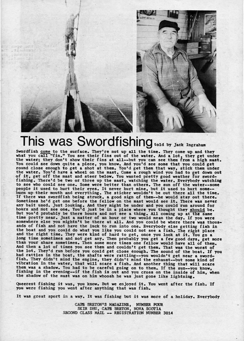 'mi, im''' This was Swordfishing told by Jack Ingraham Swordfish come to the surface. They're not up all the time. They come up and they what you call "fin." You see their fins out of the water. And a lot, they get under the water; they don't show their fins at all • but you can see them from a high mast. You could see down quite a piece, you know. And you'd see some that you could get round close enough to get a shot at them. You'd get them that way, stick them under the water. You'd have a wheel on the mast. Come a rough wind you had to get down out of it, get off the mast and steer below. You wanted pretty good weather for sword? fishing. There'd be two or three up the mast, watching the water. Everybody watching to see who could see one. Some were better than others. The sun off the water • some people it used to hurt their eyes. It never hurt mine, but it used to hurt some- burn up their mouth and everything. The sticker wouldn't be out there all the time. If there was swordfish being struck, a good sign of them • he would stay out there. Sometimes he'd get one before the fellow on the mast would see it. There was never any bait used. Just looking. And they might be under and you could run around for hours and not see one. You'd just be in a place where you thought they should be. But you'd probably be there hours and not see a thing. All coming up at the same time pretty near. Just a matter of an hour or two would mean the day. If you were somewhere else you mightn't be there at all. And you could be where there was thous? ands of fish and not have the luck to run into one. Everybody else getting fish in the boat and you could do what you like you could not see a fish. The right place and the right time. They were kind of hard to get, once you look at it. You go a long time sometimes and not get any. Then probably you get a few good days, get more than your share sometimes. Then some more times one fellow would have all of them. And then a lot of times you see them and couldn't get them. That was the worst of the lot. They'd run before you could get close enough. The sound of the boat. If you had rattles in the boat, the shafts were rattling • you wouldn't get near a sword- fish. They didn't mind the engine, they didn't mind the exhaust • but some kind of vibration in the water, that will scare a fish. And another thing that will scare them was a shadow. You had to be careful going on to them. If the sun • you know, fishing in the evening • if the fish is out and you cross on the inside of him, when the shadow of the mast was on him whoosh he was just gone like lightning. Queerest fishing it was, you know. But we enjoyed it. You went after the fish. If you were fishing you went after anything that was fish. It was great sport in a way. It was fishing but it was more of a holiday. Everybody CAPE BRETON'S MAGAZINE, NUMBER FOUR SKIR DHU, CAPE BRETON, NOVA SCOTIA SECOND CLASS MAIL • REGISTRATION NUMBER 3014