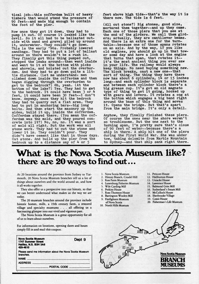 Published by Ronald Caplan on 1979/8/1 (765 reads)tical job • this cofferdam built of heavy timbers that would stand the pressure of 90 feet • and made big enough to contain the foot of the pier. Now once they got it down, they had to pump it out. Of course it leaked like the devil. So it all had to be ballasted out? side with sand and gravel piled up around it, underwater. They couldn't go down. This is the early '90s. Probably lowered sandbags. They had to put a lot of ballast around so there wouldn't be a rush in. They finally got this thing pumped out, stopped the leaks around • then went inside and went to it at the bottom with picks and shovels, and hoisted out the overbur? den. And they had to go down quite a lit? tle distance. (Let me understand: men climbed down inside the cofferdam and then began digging through the overburden to get to the bedrock?) Oh, yeah. (At the bottom of the lake?) Yes. They had to get to the bedrock. It could have been 3 or ' feet, it could have been 30 feet • I don't know. Anyway, once they hit the bedrock they had to quarry out a flat area. They had to put in anchoring bars • big long bolts. And then start the masonry up the sides, build it up, inside the cofferdam. Cofferdam stayed there. (You mean the cof? ferdam was the mold, and they poured con? crete into it?) No, no, no. It was a sort of mold all right. But the work was all stone work. They had to cut the stone and lower it in. They couldn't pour. They didn't have cement like that in those days. Cut stone. And build up the pier from the bedrock up to a distance say of 4 or 5 feet above high tide • that's the way it is there now. The tide is 6 feet. (All cut stone?) Big stones, good size, mortared them together • and up they came. Each one of those piers that you see at the end of the girders. We call them gird? ers; actually, they are cantilever beams. And there is an extra one for the turn? table • because one of those spans rotates on an axis. And by the way, if you like old engines, you should go up in that tow? er some day and have a look at the engine that turns that span, that rotates it • it's the most ancient thing you ever saw in your life. The railway would always keep things. No need buying something new. The block breaks, cast a new one • that sort of thing. The thing they have there now has about 6 cylinders, 14 or 15 inches long • and each cylinder block is separate and between each cylinder block there's a big grease cup. It's got an old magneto type of thing to get it going, hooked up with gears and levers. It rotates a cog at the bottom which engages a big band right around the base of this thing and moves it. Opens the bridge. But that's apart from the main bridge. It's only a detail. Anyhow, they finally finished these piers. Of course the ones near the shore weren't so troublesome. But the one next to the turning span, I'm pretty sure that's close of 90 feet of water • because there's a ship in there. A ship hit one of the piers during the First World War. She was under tow, taking dolomite from Marble Mountain to Sydney • and that ship sank right there. What is the Nova Scotia Museum like? there are 20 'svays to find out... At 20 locations around the province from Sydney to Yar? mouth, 20 Nova Scotia Museum branches tell us a lot of things about ourselves and the world around us, and how it all works together. They also offer us a perspective into our history, so that we can better understand what makes us the way we are today. The 20 museum branches around the province include historic homes, mills, a 19th century farm, a restored village and specialty museums ... all offering us a fascinating glimpse into our vivid and vigorous past. The Nova Scotia Museum is a great opportunity for all of us to learn about ourselves. For information on locations, opening dates and hours simply fill in and mail this coupon. Dept 9 : Nova Scotia Museum : 1747 Summer Street • Halifax, N.S. B3H 3A6 : 429-46ia : Please send me information about the Nova Scotia Museum • branches. • NAME : ADDRESS • POSTAL CODE 1. Nova Scotia Museum 2. History Branch, Citadel Hill 3. Ross Farm Museum 4. Lunenburg Fisheries Museum 5. Wile Carding Mill 6. Perkins House 7. Ross-Thomson House 8. Barrington Woolen Mill 9. Firefighters Museum of Nova Scotia 10. North Hills Museum 11. Prescott House 12. Haliburton House 13. Uniacke House 14. Lawrence House 15. Balmoral Grist Mill 16. Sutherland's Steam Mill 17. McCulloch House 18. Sherbrooke Village 19. Cossit House 20. Fisherman's Life Museum