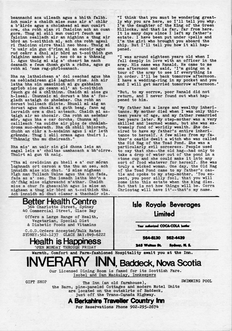 beannachd aca uileadh agus a bhith falbh. Ach nuair a chaidh mise suas air a' chlar a b'airde agus a choimhead mi mun cuairt orm, cha robh sian ri fhaicinn ach an cuan gorm. Thug mi suil mun cuairt feuch am faicinn sealladh air an highinn a thug air bord an t-soithich mi, ach cha robh sgeul ri fhaicinn oirre thall neo bhos. Thuig mi • n uair sin gun d'rinn'mi an eucoir agus rud cearr a dhol'air bord an t-soithich gun faighinn amach c6 i, neo c6 as a thanaig i. Agus thuig mi aig a' cheart hm nach deanadh e feum dhomh guth a radha, agus gu robh mi 'nam rag-phriosanach. Bha na lathaichean a' dol seachad agus bha na sebladairean gle laghach rium. Ach air latha bha sin smaoinich mi gu gabhainn sgriob sios gu ceann eil' an t-soithich feuch gu de a chithinn. Chaidh mi sios gu h-iseal. Chunnaic mi dorust a bha a' fos- gladh astaigh do sheombar. Cha robh an dorust buileach duinte. Bhuail mi aig an dorust agus chuala mi guth beag, fann ag iarraidh orm a dhol asteach. Chaidh mi as? taigh air mo shocair. Cha robh an sebmbar mor, agus bha e car dorcha. Chunna mi cailleach 'na suidhe air pios de chnaimh- droma muc-mharadh. Bha da shuil bhiorach, dhubh an clar a h-aodainn agus i air leth grannda. Thug i siiil ormsa agus thuirt i, "Thanaig thu mu dheireadh." Bha mis' an uair sin gle dhona leis an eagal leis a' choltas uamhasach a bh'oirre. Thuirt mi gun ta naig. "Tha mi creidsinn gu bheil e a' cur moran ioghnadh ort carson a tha thu an seo, ach innsidh mise sin dhut. "S mise nighean Righ nan Tullach Uaine agus tha sin fada, fada as a' seo. Tha iomadh latha bho'n a dh'fhag mise oighreachd m'athar. Chaidh mise a chur fo gheasaibh agus is mise an nighean a thug air bord an t-soithich thu. Ach innsidh mi dhut ciamar a thachair sin. "I think that you must be wondering great? ly why you are here, so I'll tell you why. I'm the daughter of the King of the Green Hillocks, and that is far, far from here. It is many days since I left my father's estate. I have been put under spells and I'm the girl who brought you aboard the ship. But I'll tell you how it all hap? pened. "I was around eighteen years old when I fell deeply in love with an officer in the army. His name was Ranald. He came to me one afternoon and said, 'I'm going on a tour of the army to see if everything is in order. I'll be back tomorrow afternoon. I have a wedding-ring in my pocket and you and I will get married tomorrow afternoon.' "But, to my sorrow, poor Ranald did not return, and I never found out what hap? pened to him. "My father had a large and wealthy inheri? tance. My mother died when I was only thir? teen years of age, and my father remarried two years later. My step-mother was a very skilled and learned woman, but she was ex? tremely fond of worldly wealth. She de? sired to have my father's entire inheri? tance to herself. A few miles from my fa? ther's castle dwelt a witch who was called the Old Hag of the Toad Pond. She was a particularly evil sorceress. People used to say that she • the old hag • had only to take a drop of water out of the pond in a stone cup and she could make it into any sort of food whatever for herself. She was truly a wicked womam. One day, the Old Hag of the Toad Pond came to my father's cas? tle and spoke to my step-mother, 'You ex? pect, you poor silly fool, that you will come into this estate when the king dies. But that is not how things will be. Corra Chriostag will have it* • that's my name. Better Health Centre 364 Charlotte Street, Sydney 40 Commercial Street, Glace Bay Offers a Large Range of Health, Vegetarian, Special Diet & Diabetic Foods and Vitamins C.O.D.Orders Accepted/Bulk Rates SYDNEY:562-1237 GLACE BAY:849-6222 Health is Happiness OPEN MONDAY THROUGH FRIDAY Isle Royale Beverages Limited Yov aiiriieriMd COCA-COU beiliw 564'30 562-4439 Warmth, Comfort and Farm-fashioned Hospitality await you at the Inn. INVERARY INN. Baddeck. Nova Scotia Our Licensed Dining Room is famed for its Scottish Fare. Isobel and Dan MacAulay, Innkeepers GIFT SHOP The Inn (an old farmhouse), SWIMMING POOL the Barn, pine-paneled Cottages and modern Motel Units are located on the outskirts of Baddeck, just off the Trans-Canada Highway. A Berkshire TramHer Country lm For Reservations Phone 902-295-2674