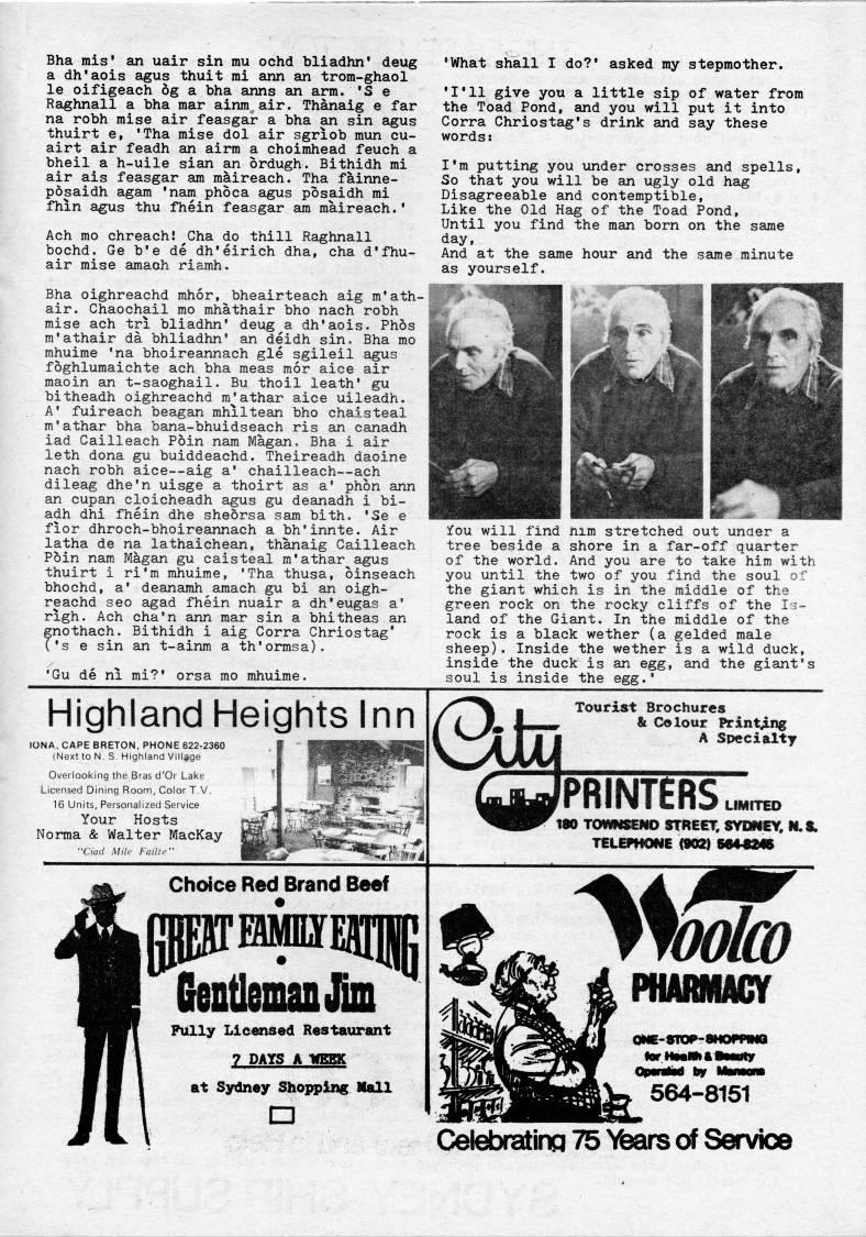Bha mis' an uair sin mu ochd bliadhn' deug a dh'aois agus thuit mi ann an trom-ghaol le oifigeach 6g a bha anns an arm. 'S e Raghnall a bha mar ainm air. Thanaig e far na robh mise air feasgar a bha an sin agus thuirt e, 'Tha mise dol air sgriob mun cu? airt air feadh an airm a choimhead feuch a bheil a h-uile sian an brdugh. Bithidh mi air ais feasgar am maireach. Tha fainne- posaidh agam 'nam phoca agus pbsaidh mi fhin agus thu fhein feasgar am maireach.' Ach mo chreach!'Cha do thill Raghnall bochd. Ge b'e de dh'eirich dha, cha d'fhu- air mise amaoh riamh. Bha oighreachd mhor, bheairteach aig m'ath- air. Chaochail mo mhathair bho nach robh mise ach tri bliadhn' deug'a dh'aois. Phbs m'athair da bhliadhn' an deidh sin. Bha mo mhuime 'na bhoireannach gle sgileil agus fbghlumaichte ach bha meas mor aice air maoin an t-saoghail. Bu thoil leath' gu bitheadh oighreachd m'athar aice uileadh. A' fuireach beagan mhiltean bho chaisteal m'athar bha bana-bhuidseach ris an canadh iad Cailleach Pbin nam Magan. Bha i air leth dona gu buiddeachd. Theireadh daoine nach robh aice • aig a' chailleach • ach dileag dhe'n uisge a thoirt as a' phbn ann an cupan cloicheadh agus gu deanadh i bi- adh dhi fhein dhe sheorsa sam bith. 'Se e fior dhroch-bhoireannach a bh'innte. Air latha de na lathaichean, thanaig Cailleach Pbin nam Magan gu caisteal m'athar'agus thuirt i ri'm mhuime, 'Tha thusa, binseach bhochd, a' deanamh amach gu bi an oigh? reachd seo agad fhein nuair a dh'eugas a' righ. Ach cha'n ann mar sin a bhitheas an fnothach. Bithidh i aig Corra Chriostag* • s e sin an t-ainm a th'ormsa). 'Gu de ni mi?' orsa mo mhuime. 'What shall I do?' asked my stepmother. 'I'll give you a little sip of water from the Toad Pond, and you will put it into Corra Chriostag's drink and say these words: I'm putting you under crosses and spells. So that you will be an ugly old hag Disagreeable and contemptible. Like the Old Hag of the Toad Pond, Until you find the man born on the same day. And at the same hour and the same minute as yourself. You will find him stretched out unaer a tree beside a shore in a far-off quarter of the world. And you are to take him with you until the two of you find the soul of the giant which is in the middle of the green rock on the rocky cliffs of the Is? land of the Giant. In the middle of the rock is a black wether (a gelded male sheep). Inside the wether is a wild duck, inside the duck is an egg, and the giant's soul is inside the egg.' Highland Heights Inn lONA, CAPE BRETON, PHONE 622-2360 (Next to N. S. Highland Village Overlooking the Bras d'Or Lake Licensed Dining Room, Color TV, 16 Units, Personalized Service Your Hosts Norma & Walter MacKay "Gad Mile Failte" Choice Red Brand Beef Gentleman Jim Fully Licensed Restaurant 7 DAYS ATIEEK at Sydney Shopping Mall Tourist Brochures & Colour Printjlng A Specialty PRINTERS LIMITED 180 TOWNSEND STREET, SYDNEY. N.S. TEL'HONE (902) S64?MS Celebratina 75 Years of Service