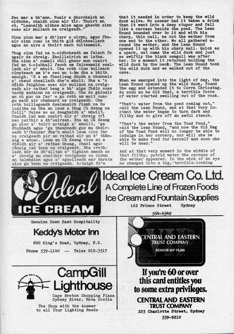 Seo mar a bh'ann. Nuair a dhorchaich an oidhche, chaidh sinn air tir. Thuirt an Cli, "Leanaibh sibhse mise agus gheobh sinn suas air mullach na creigeadh." Rinn sinn mar a dh'iarr e oirnn, agus fhu? air sinn suas le bhith gle dhicheallach agus an aire a thoirt nach tuiteamaid. Thug sinn fad na h-oidhcheadh am falach fo sgeir de chreig. Shoilleirich an latha. Bha sinn a' cumail sliil gheur mun cuairt fad an t-siubhail feuch am faiceamaid seal? ladh air a' mhult. Cha robh sinn buileach cinnteach am b'e seo an t-am dha a bhith. amuigh. 'S e an fhaoileag dhubh a chunnaic a' cheud shealladh dhe'n mhult. Bha e 'n deidh faighinn suas air mullach na creig? eadh air rathad beag a bh' aige fhein suas taobh aodainn na creigeadh. Cha do ghluais an cu gus na fac' e gu robh am mult suas gu math air cbmhnard na creigeadh. Cha robh boillsgeadh dealanaich riamh na bu luaithe na bha an leum a thug Cu Seang na Coill' Uaine as as deaghaidh a* mhuilt. Chaidh iad mun cuairt air a' chreig tri neo ceithir a dh'uairean. Bha an Cu Seang gu sior a' toirt astaigh a' mhuilt, 'ga dhubhadh agus 'ga theannadh gus mu dheir? eadh b'fheudar dha'n mhult leum sios far na creigeadh air an rathad air an d' than? aig e anuas. Leum an Cu Seang sios as a dheidh air a' rathad bheag, chaol agus ranaig'iad bonn na creigeadh. Bha sruth- ladh mor de dh'alltan a' tighinn amach as a* chreig mu cheithir troighean os cionn an talmhainn agus a' sgaoileadh mar bhrata 'Xos gu bonn na creigeadh. Astaigh fo'n that it needed in order to keep the wild duck alive. No sooner had it taken a drink than it went into a deep stupor and fell like a carcass beside the pond. The Lean Hound bounded over to it and with his sharp, thin nail, he cut the wether from one end to the other. We all gathered a- round the wether, and the Lean Hound opened it up with his sharp nail. Quick as a spark, out came the wild duck and just as swiftly the black seagull was after her. In a moment it returned holding the wild duck by the neck. The Lean Hound took the wild duck and we walked out of the cave. When we emerged into the light of day, the Lean Hound opened up the wild duck, found the egg and extended it to Corra Chriostag. As soon as he did that, a terrible force of water started swelling out of the rock. "That's water from the pond coming out," said the Lean Hound, and at that very in? stant the water began to tum dark and filthy and to give off an awful stench. "That's the water from the Toad Pond," said the Lean Hound, "and now the Old Hag of the Toad Pond will no longer be able to indulge in her sorcery, nor will she be able to make food for herself and soon she will be dead." And at that very moment in the middle of that filthy, putrid water the carcass of the wether appeared. In the wink of an eye he changed into a big,-'terrible-looking Ideal Ice Cream Co. Ltd A Corrplete Line of Frceien Foods Ice Cream and Fountain Suppfies 162 Prince Street Sydney Genuine Down East Hospitality Keddy' Motor Irm 600 King's Road, Sydney, N.S. Phone 539-11'0 • Telex 019-351? '--..' CampGill -k'' Lighthouse dH Cape Breton Shopping Plaz? Sydney River, The Shop with the Answer to all Your Lighting Needs lENTRAl AND EASTERN Senior VIP pian IfyoulreOOorover this caitl entitles YOU to some extra privili'ges. CENTRAL AND EASTERN TRUSTCOMPANY 225 Charlotte Street, Sydney 539-9210