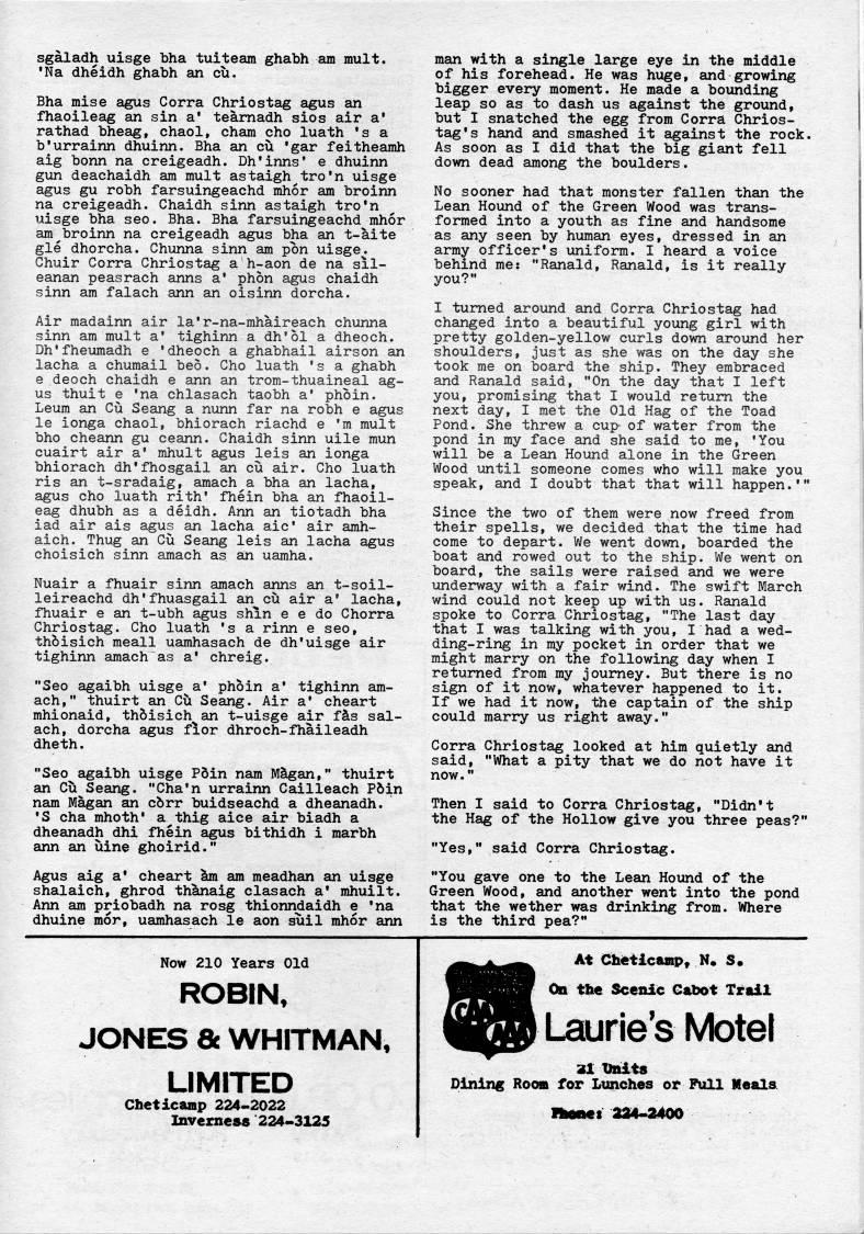 sgaladh uisge bha tuiteam ghabh am mult. 'Na dheidh ghabh an cu. Bha mise agus Corra Chriostag agus an fhaoileag an sin a' tearnadh sios air a' rathad bheag, chaol, cham cho luath 's a b'urrainn dhuinn. Bha an cu 'gar feitheamh aig bonn na creigeadh. Dh'inns' e dhuinn gun deachaidh am mult astaigh'tro'n uisge agus gu robh farsuingeachd mhor am broinn na creigeadh. Chaidh sinn astaigh tro'n uisge bha seo. Bha. Bha farsuingeachd mhor am'broinn na creigeadh agus bha an t-aite gle dhorcha. Chunna sinn am pon uisge'. Chuir Corra Chriostag a h-aon de na sil- eanan peasrach anns a' phon agus chaidh sinn am falach ann an oisinn dorcha. Air madainn air la'r-na-mhaireach chunna sinn am mult a' tighinn a dh'ol a dheoch. Dh'fheumadh e 'dheoch a ghabhail airson an lacha a chumail beo. Cho luath 's a ghabh e deoch chaidh e ann an trom-thuaineal ag? us thuit e 'na chlasach taobh a' phbin. Leum an Cu Seang a nunn far na robh e agus le ionga chaol, bhiorach riachd e 'm mult bho cheann gu ceann. Chaidh sinn uile mun cuairt air a' mhult agus leis an ionga bhiorach dh'fhosgail an cu air. Cho luath ris an t-sradaig, amach'a bha an lacha, agus cho luath rith' fhein bha an fhaoil? eag dhubh as a deidh. Ann an tiotadh bha iad air ais agus an lacha aic' air amh- aich. Thug an Cu Seang leis an lacha agus choisich sinn amach as an uamha. Nuair a fhuair sinn amach anns an t-soil- leireachd dh'fhuasgail an cu air a' lacha, fhuair e an t-ubh agus shin e e do Chorra Chriostag. Cho luath 's a rinn e seo, thbisich meall uamhasach de dh'uisge air tighinn amach as a' chreig. "Seo agaibh uisge a' phoin a' tighinn am? ach," thuirt an Cx Seang. Air a* cheart mhionaid, thbisich an t-uisge air f's sal- ach, dorcha agus fior dhroch-fhaileadh dheth. "Seo agaibh uisge P5in nam M??'an," thuirt an Cli Seang. "Cha'n urrainn Cailleach P6in nam Magan an cbrr buidseachd a dheanadh. 'S cha mhoth' a'thig aice air biadh a dheanadh dhi fhein agus bithidh i marbh ann an uine ghoirid." Agus aig a* cheart lun am meadhan an uisge shalaich, ghrod thanaig clasach a' mhuilt. Ann am priobadh na rosg thionndaidh e 'na dhuine mor, usunhasach le aon suil mhor ann man with a single large eye in the middle of his forehead. He was huge, and growing bigger every moment. He made a bounding leap so as to dash us against the ground, but I snatched the egg from Corra Chrios? tag 's hand and smashed it against the rock. As soon as I did that the big giant fell down dead among the boulders. No sooner had that monster fallen than the Lean Hound of the Green Wood was trans? formed into a youth as fine and handsome as any seen by human eyes, dressed in an army officer's uniform. I heard a voice behind me: "Ranald, Ranald, is it really you?" I turned around and Corra Chriostag had changed into a beautiful young girl with pretty golden-yellow curls down around her shoulders, just as she was on the day she took me on board the ship. They embraced and Ranald said, "On the day that I left you, promising that I would return the next day, I met the Old Hag of the Toad Pond. She threw a cup of water from the pond in my face and she said to me, 'You will be a Lean Hound alone in the Green Wood imtil someone comes who will make you speak, and I doubt that that will happen.'" Since the two of them were now freed from their spells, we decided that the time had come to depart. We went down, boarded the boat and rowed out to the ship. We went on board, the sails were raised and we were underway with a fair wind. The swift March wind could not keep up with us. Ranald spoke to Corra Chriostag, "The last day that I was talking with you, I had a wed? ding-ring in my pocket in order that we might marry on the following day when I returned from my journey. But there is no sign of it now, whatever happened to it. If we had it now, the captain of the ship could marry us right away." Corra Chriostag looked at him quietly and said, "What a pity that we do not have it now." Then I said to Corra Chriostag, "Didn't the Hag of the Hollow give you three peas?" "Yes," said Corra Chriostag. "You gave one to the Lean Hound of the Green Wood, and another went into the pond that the wether was drinking from. Where is the third pea?" Now 210 Years Old ROBIN, JONES & WHITMAN, LIMITED Cheticamp 224-2022 Inverness 224-3125 9 At CheticafflPy N* S* On tbe Scenic Gabot Trail Laurie's Motel al Units Dining Rooa for Lunches or Pull Meals 234-2400