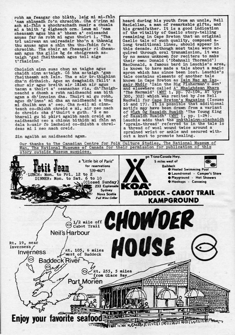 robh am feasgar cho blath, leig mi mi-fhin 'nam shineadh fo'n chraoibh. Cha d'rinn mi ach mi-fhin a shochrachadh nuair a chuala mi a bhith 'g eigheach orm. Leum mi 'nam sheasamh agus bha a' bhean a' coiseachd anuas far na robh mi agus thuirt i, "Tha tri uairean an uaireadair bho'n a thanaig thu anuas agus a shin thu thu-fhein fo'n chraoibh. Tha chairman fheasgair ri dhean? amh agus tha gille bg de choigreach as? taigh 'gad fheitheamh agus toil aige t'fhaicinn." Choisich sinn suas chun an taighe agus chaidh sinn astaigh. Co bha astaigh 'gam fheitheamh ach Iain. Tha e air ur-thighinn dha'n duthaich. Agus an deaghaidh failt' a chur air agus breith air 13.imh air agus tacan a thoirt a' seanachas ris, dh'fhoigh- neachd e dhomh a robh naidheachd sam bith agam a dh'innsinn dha. Thuirt mi gu robh, agus dh'inns' mi dha an naidheachd a thug mi dhuibh ann a' seo. Cha n-eil mi cinn? teach co-dhiubh chreid e mi, air neo nach do chreid: cha d'thuirt e guth. 'S e mo bharail gu bi pairt agaibh nach creid'an naidheachd seo a chionn bithidh mi fhin an dala h-uair fo imcheisd co-dhiubh a chrei- deas mi i neo nach creid. Sin agaibh an naidheachd again. heard during his youth from an uncle, Neil MacLellan, a man of remarkable gifts, and his grandfather. It is a good indication of the vitality of Gaelic story-telling remaining in Cape Breton that an original Gaelic tale of such quality, composed a- long traditional lines, should appear in this decade. Although most tales were ac? quired through oral transmission, it was by no means unknown for reciters to make their own: Donald ('Dbmhnall Thormaid') MacDonald, a famous bard in Lauchie's area, is known to have made a tale about a magic apron which has since been lost. Lauchie's tale contains elements of another tale known in Cape Breton as Iain Mac an las- gair Mhbir 'Iain the Big Fisherman's Son' and elsewhere called A' Mhaighdean Mhara 'The Mermaid' (WHT 1, pp-. 72-10', AT type 300, 302) which was recited by Joe Neil MacNeil for Cape Breton's Magazine (Issues 16 and 17). It IS possible that additional motifs may have been drawn from a variant of Righ 5g Easaidh Ruaidh 'The Young King of Easaidh Ruaidh' (WHT 1, pp. 1-24). Lauchie adds that the sniithlainn-siachaidh 'sprain-thread' referred to in the tale is a thread of wool wound twice around a sprained wrist or ankle and secured with? out a knot to promote healing. Our thanks to The Canadian Centre for Folk Culture Studies. The National Museum of Man, The National Museums of Canada for their permission for publication of this story outside Museum auspices. "Little bit of Paris" for reservations 539'1671 aUNCH: Mon. to Fri. 12 to 2 DINNER: Mon. to Sat. 6 to 10 t'(Closed Sunday) 233 Esplanade! Sydney Nova Scotia FuU Wine CeUar pn Trans'Canada Hwy. V '' 5 miles west of Tk Baddeck • Heated Swimming Pool • Laundromat - Camper's Store • Playground - Hot Showers • Hookups • Canoeing BADDECK - CABOT TRAIL KAMPGROUND Rt. 19, near Inverness' Inverness 1/2 mile off Cabot Trail Neil's Harbour Rt. 105, 6 miles West of Baddeck Baddeck'Rivers' emitoat Enjoy your favorite seafood: