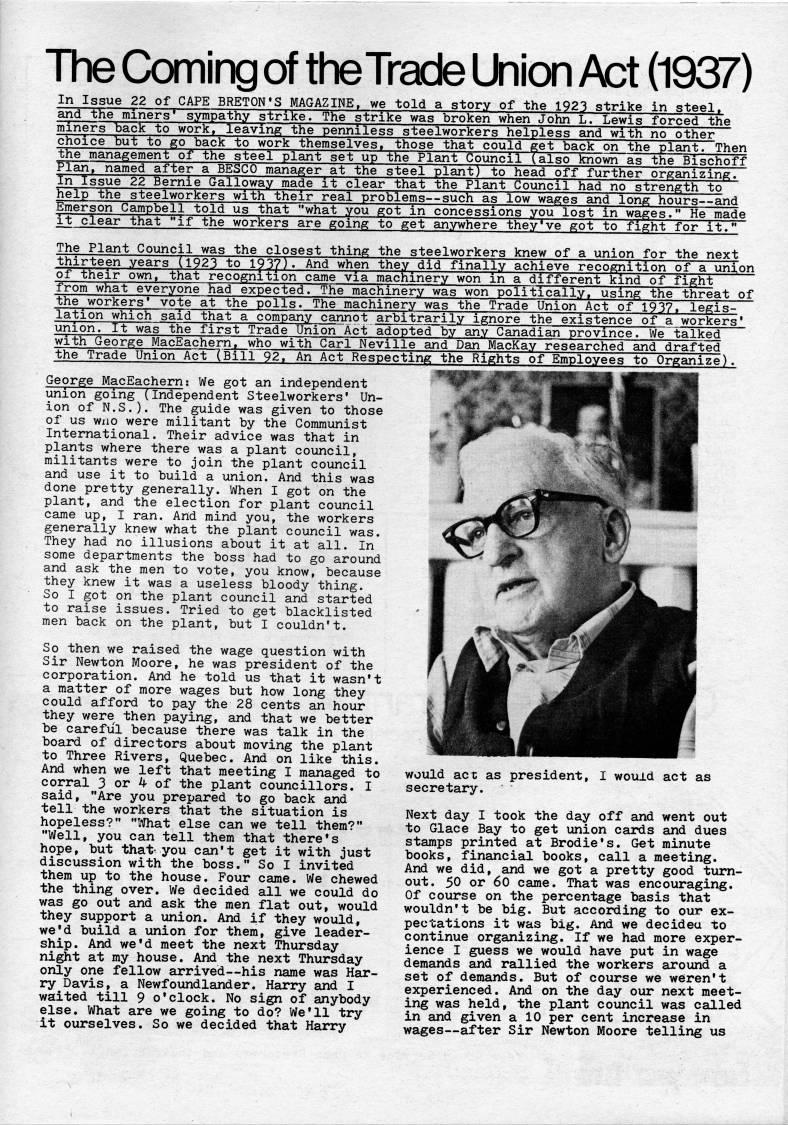 The Coming of theTrade Union Act (1937) In Issue 22 of CAPE BRETON'S MAGAZINE, we told a story of the 1923 strike in steel, and "tTie miners' sympathy strike. The strike was broken when John L. Lewis forced the miners back to work, leaving the penniless steelworkers helpless and with no other "choice but to go back to work themselves, those that could get back on the plant. Then the management of the steel plant set up the Plant Council (also known as the Bischoff Plan, named after a BESCO manager at the steel plant) to head off further organizingT" In Issue 22 Bernie Galloway made it clear that the jPlant Council had no strength to help the steelworkers with their real problems • such as low wages and long hours • and Emerson Campbell told us that "what you got in concessions you lost m wages." He made it clear that "if the workers are going to get anywhere they've got to fight for it.'' The Plant Council was the closest thing the steelworkers knew of a union for the next thirteen years (1923 to 1937). And when they did finally achieve recognition of a union of their own, that recognition came via machinery won m a different kind of fight from what everyone had expected. The machinery was won politically, using the threat of the workers' vote at the polls. The machinery was the Trade Union Act of 1937. legis? lation which said that a company cannot arbitrarily ignore the existence of a workers' union. It was the first Trade Union Act adopted by any Canadian province. '/Je talked with George MacEachern, who with Carl Neville and Dan MacKay researched and drafted the Trade Union Act (Bill 92, An Act Respecting the Rights of Employees to Organize). George MacEachern; We got an independent union going (Independent Steelworkers' Un? ion of N.S.). The guide was given to those of us WHO were militant by the Communist International. Their advice was that in plants where there was a plant council, militants were to join the plant council and use it to build a union. And this was done pretty generally. When I got on the plant, and the election for plant council came up, I ran. And mind you, the workers generally knew what the plant council was. They had no illusions about it at all. In some departments the boss had to go around and ask the men to vote, you know, because they knew it was a useless bloody thing. So I got on the plant council and started to raise issues. Tried to get blacklisted men back on the plant, but I couldn't. So then we raised the wage question with Sir Newton Moore, he was president of the corporation. And he told us that it wasn't a matter of more wages but how long they could afford to pay the 28 cents an hour they were then paying, and that we better be careful because there was talk in the board of directors about moving the plant to Three Rivers, Quebec. And on like this. And when we left that meeting I managed to corral 3 or ' of the plant councillors. I said, "Are you prepared to go back and tell the workers that the situation is hopeless?" "What else can we tell them?" "Well, you can tell them that there's hope, but that- you can't get it with just discussion with the boss." So I invited them up to the house. Four came. We chewed the thing over. We decided all we could do was go out and ask the men flat out, would they support a union. And if they would, we'd build a union for them, give leader? ship. And we'd meet the next Thursday night at my house. And the next Thursday only one fellow arrived • his name was Har? ry Davis, a Newfoundlander. Harry and I waited till 9 o'clock. No sign of anybody else. What are we going to do? We'll try it ourselves. So we decided that Harry would act as president, I would act as secretary. Next day I took the day off and went out to Glace Bay to get union cards and dues stamps printed at Brodie's. Get minute books, financial books, call a meeting. And we did, and we got a pretty good turn? out. 50 or 60 came. That was encouraging. Of course on the percentage basis that wouldn't be big. But according to our ex? pectations it was big. And we decidea to continue organizing. If we had more exper? ience I guess we would have put in wage demands and rallied the workers around a set of demands. But of course we weren't experienced. And on the day our next meet? ing was held, the plant council was called in and given a 10 per cent increase in wages • after Sir Newton Moore telling us