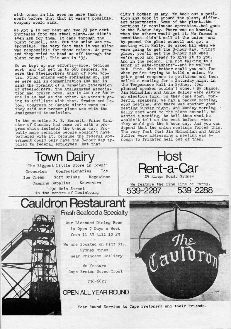 with tears in his eyes no more than a month before that that it wasn't possible, company would sink. We got a 10 per cent and two 7"2 per cent increases from the steel plant • we didn't even ask for them. It came through the plant council, see. But the union was re? sponsible. The very fact that it was alive was responsible for those raises. We grew and they tried to head us off through the plant council. This was in '35. So we kept up our efforts • slow, tedious work • and did get up to 660 members. We were the Steelworkers Union of Nova Sco? tia. Other unions were springing up, and we were all in commimication and had in mind the forming of a Canadian federation of steelwo.;kers. The Amalgamated Associa? tion had broken down. Was it 4000 or 8000? One is as bad as the other. We weren't go? ing to affiliate with that. Trades and La? bour Congress of Canada didn't want us. They said our proper place was with the Amalgamated Association. In the meantime R. B. Bennett,, Prime Mini? ster of Canada, had come out with a pro? gram which included the 8-hour day. Pro? bably more sensible people wouldn't have bothered with it, because the federal gov? ernment could only have the 8-hour day ap? plied to federal employees. But that didn't bother us any. We took out a peti? tion and took it around the plant, differ? ent departments. Some of the plant • the portions in continuous operation • had gone on the 8-hour day. There was no knowing when the others would get it. We formed a committee • didn't call it the union • and by-passed the plant council and got a meeting with Kelly. We asked him when we were going to get the 8-hour day. "First place, you'll get the 8-hour day when we're good and ready to give it to you. And in the second, I'm not talking to a bunch of gate-crashers" • and he walked out. Fine. What better could you ask for when you're trying to build a union.- We got a good response to petitions and then called a meeting for a Saturday night in the Temperance Hall in Sydney. (Our planned speaker couldn't come.) By chance, Jim McLachlan and Annie Buller were giving an election talk. So they came down. Won? derful speakers. We had a packed meeting, good meeting. And there was another good meeting Sunday night. And Monday morning - Kelly sent word to the plant council, he wanted a meeting, to tell them what he wouldn't tell us the week before • when they would get the 8-hour day. And you can depend that the union meetings forced this. The very fact that Jim McLachlan and Annie Buller were addressing a meeting was e- nough to frighten hell out of them. Town Dairy "The Biggest Little Store in Town!" Groceries Confectionaries Ice Ice Cream Soft Drinks Magazines Camping Supplies Souvenirs 1290 Main Street in the centre of Louisbourg Host Rent-a-Car 24 Kings Road, Sydney We feature the fine line of Fords. 539-2287 539-2288 Cauldron Restaurant Fresh Seafood a Specialty Our Licensed Dining Room is Open 7 Days a Week from 11 AM- till 10 PM We are located on Pitt St., Sydney Mines near Princess Colliery We feature Cape Breton Devco Trout 736-6823 OPEN ALL YEAR ROUND Year Round Service to Cape Bretoners and their Friends.