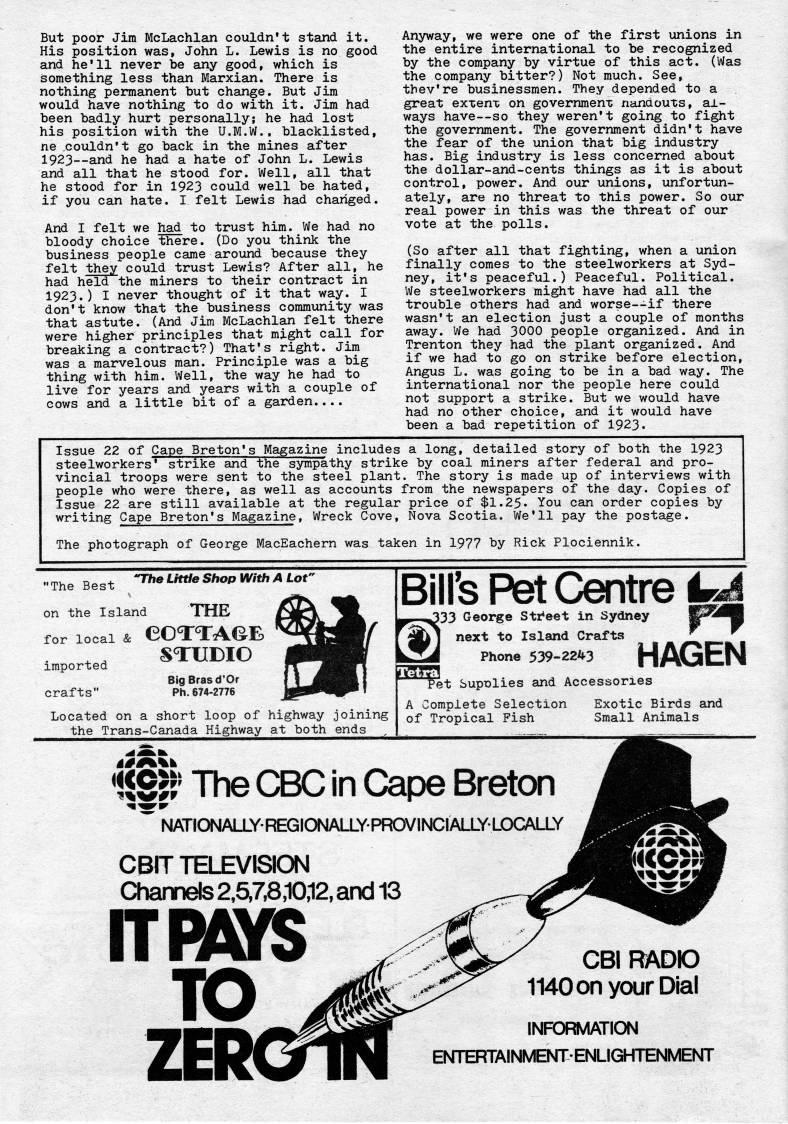 Published by Ronald Caplan on 1979/8/1 (274 reads)But poor Jim McLachlan couldn't stand it. His position was, John L. Lewis is no good and he'll never be any good, which is something less than Marxian. There is nothing permanent but change. But Jim would have nothing to do with it. Jim had been badly hurt personally; he had lost his position with the U.M.W.. blacklisted, ne couldn't go back in the mines after 1923 • and he had a hate of John L. Lewis and all that he stood for. Well, all that he stood for in 1923 could well be hated, if you can hate. I felt Lewis had changed. And I felt we had to trust him. We had no bloody choice there. (Do you think the business people came around because they felt they could trust Lewis? After all, he had held the miners to their contract in 1923.) I never thought of it that way. I don't know that the business commimity was that astute. (And Jim McLachlan felt there were higher principles that might call for breaking a contract?) That's right. Jim was a marvelous man. Principle was a big thing with him. Well, the way he had to live for years and years with a couple of cows and a little bit of a garden.... Anyway, we were one of the first unions in the entire international to be recognized by the company by virtue of this act. (Was the company bitter?) Not much. See, thev're businessmen. They depended to a great extent on government nandouts, al? ways have • so they weren't going to fight the government. The government didn't have the fear of the union that big industry has. Big industry is less concerned about the dollar-and-cents things as it is about control, power. And our unions, unfortun? ately, are no threat to this power. So our real power in this was the threat of our vote at the polls. (So after all that fighting, when a union finally comes to the steelworkers at Syd? ney, it's peaceful.) Peaceful. Political. We steelworkers might have had all the trouble others had and worse--if there wasn't an election just a couple of months away. We had 30OO people organized. And in Trenton they had the plant organized. And if we had to go on strike before election, Angus L. was going to be in a bad way. The international nor the people here could not support a strike. But we would have had no other choice, and it would have been a bad repetition of 1923. Issue 22 of Cape Breton's Magazine includes a long, detailed story of both the 1923 steelworkers' strike and the sympathy strike by coal miners after federal and pro? vincial troops were sent to the steel plant. The story is made up of interviews with people who were there, as well as accounts from the newspapers of the day. Copies of Issue 22 are still available at the regular price of $1.25. You can order copies by writing Cape Breton's Magazine, Wreck Cove, Nova Scotia. We'll pay the postage. The photograph of George MacEachern was taken in 1977 by Rick Plociennik. "The Best The Little Shop With A Lot" on the Island THE for local & eoTTAeE STUDIO imported Big Bras d'Or crafts" Ph. 674-2776 Located on a short loop of highway joining the Trans-Canada Highway at both ends , Bill's P't Centre i??J 33 George Sti*eet in Sydney fP''B next to Island Crafts ' ' '' Phone 539-2243 HAGEN I Pet bupolies and Accessories A Complete Selection Exotic Birds and of Tropical Fish Small Animals 40''k USS' The CBC in Cape Breton NATIONAIXYREGIONALLYFfiOVINCIALLYLOCALLY CBIT TELEVISION Channels 2,5'7,8,10,12, and 13 nwns TO ZE CBI RADIO 1140on your Dial INFORMATION ENTEFnAINMENTENLIGHTENMENT