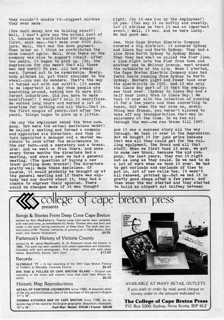 Published by Ronald Caplan on 1979/12/1 (519 reads)they couldn't handle it • biggest mistake they ever made. (How much money are we talking about?) Well, I can't give you the actual cost of it, because we contributed 200 dollars first, each man • that made over 6000 dol? lars. Well, that was the down payment. Then later on I think we contributed the same amount again. Well, from there on the company was able to support itself. After two years, it began to pick up. (So, the depression for you meant that all these men had work?) Oh yes. All had steady work. Turned out to be remarkable. Every? body pitched in, put their shoulder to the wheel • you can do wonders. That's the way it turned out with our outfit. (It seems to me important in a day when people are searching around, asking how to save dif? ferent industries. Did you have to make sacrifices?) I wouldn't call it sacrifices. We worked long hours and worked a lot of overtime for nothing and all that • that is, the first couple of years • but after two years, things began to pick up a little. (We say the employees owned the tram com? pany. How were the actual decisions made?) We called a meeting and formed a company and appointed six directors. And they in turn appointed a manager and a master me? chanic to look after the maintenance in the car barn • and a secretary and a treas? urer. And we went on from there. And once every three months the directors had a meeting, and once a year we had a general meeting. (The question of buying a new tram? putting down tracks?) The directors pretty well made those decisions. Of course, it would probably be brought up at the general meeting and if there was any? body had any doubts about it, they had a chance to express their opinion. There could be changes made if it was thought right. (So it was run by the employees?) Oh yes. (You say it so softly and sweetly, but it strikes me that it was an important event.) Well, it was. And we were lucky. We had good men. See, this Cape Breton Electric Company covered a big district. It covered Sydney and Glace Bay and North Sydney. They had a line from North Sydney to Sydney Mines. Then they had what we called the Pier line, a line right into the Pier from town and another one to Whitney Avenue, went around the outskirts of the city. When I started, the Gape Breton Electric Company also had ferry boats running from Sydney to North Sydney. Eastern Light and Power took over the electricity in I93I. And it was only the Glace Bay part of it that the employ? ees took over. (Sydney to Glace Bay and a half hour local tram in Glace Bay.) We took it over with the intention of running it for a few years and then converting to buses, but when the war came on, every? thing was frozen, you weren't allowed to take off any transportation that was in existence at the time. So we ran all through the war • we ran trams till 194?. And it was a success story all the way through. We took it over in the depression. But we bought it for junk price because that was all they could get for the rol? ling equipment, the track and all that stuff. When we first took it over, we put in some new track, because the old com? pany, the last years, they ran it right out as long as they could. So we had to do a lot of work when we took it over. We had to get carloads and carloads of ties to put in, lot of new rails too. It wasn't all renewed, patched up • but we had it in pretty good shape after a few years. And then when the war started and they started to build an airport out halfway between college of Cdpe breton press presents Songs & Stories From Deep Cove Cape Breton (edited by Ron MacEachern). Twenty songs from earlier days, connplete with note and verse, as remembered by Amby Thomas who was born and raised in the small fishing community of Deep Cove. The book also con? tains many of Mr. Thomas' memories of growing up in Cape Breton. Soft cover, over twenty illustrations $4.95 Patterson's History of Victoria County (edited by W. James MacDonald). G. G. Patterson wrote the history in 1885. The work has been updated with added appendices and footnotes. Complete with early photographs, first settlers' names and early place names. Beautifully bound, hard cover $13.00 Records 'GLENDALE '77 - A live recording of the 1977 Cape Breton Festival of Fiddlers at Glendale, Inverness County $6.50 THE RISE & FOLLIES OF CAPE BRETON ISLAND - Original cast recording of the music and comedy revue that took Cape Breton by storm $6.50 Historic Map Reproductions DETAIL OF FORTRESS LOUISBOURG (circa 1760). A beautiful detail of the city and fortifications. One of the few maps of this period in English. 11" X 16". THOMAS KITCHIN'S MAP OF CAPE BRETON (circa 1758). An ex? quisite map of the island by the English geographer. Beautifully illustrated. 12"x16" Each Map: Matted - $10.00 / Framed - $30.00 AVAILABLE AT MANY RETAIL OUTLETS. // you wish to order by mail, send cheque or money order in the amount indicated to: The College of Cape Breton Press P.O. Box 5300, Sydney, Nova Scotia, BIP 6L2
