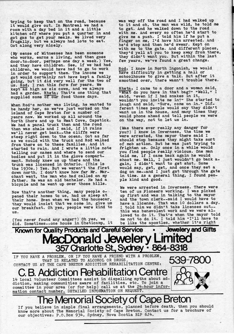 Published by Ronald Caplan on 1979/12/1 (299 reads)trying to keep that on the road, because it would give out. In Montreal we had a room with a day bed in it and a little kitchen off where you put a quarter in and got gas to get your meals. We lived very frugally, but we always had lots to eat. Got along very nicely. (% sense of Witnesses has been someone who works, earns a living, and then goes door-to-door, perhaps one day a week.) Yes, and they have children. See, if we had had children, we would have had to go to work in order to support them. The income we got would certainly not have kept a family going, but it did very well for the two of us. Rod; I ran this farm for years. We kept as high as six cows, and we always had a garden. Rheta; That's one thing that supplied some of our food those days. When Rod's mother was living, he wanted to be handy her, so we've just worked on the island of Cape Breton for a number of years now. We worked up all around the North Shore and up to Meat Cove, Capstick. We had a panel truck then and the road then was shale and I said, if it rains we'll never get back • the cliffs were steep right down to the ocean. Got as far as we could with the truck and Rod walked from there on to tliese families. And it started to rain. And I wrote a little note telling our names and where to send our bodies and put it in the glove compart? ment. Nobody knew us up there and the truck was licensed in Ontario. (This is the 1930s.) Yes. But we weren't the first down north. I doa't know how far Mr. Mar- chant went, the man who had called on my father. He was an old bachelor. He had a bicycle and he went up over those hills. Now that's another thing, many people o- pened their homes to us, had us sleep at their home. Even when we had the housecar, they would insist that we come in, give us our breakfast. Oh yes, people were kind to (You never found any anger?) Oh yes, we did. Sometimes • one house in Cheticamp, it was way off the road and I had walked up to it and oh, the man was wild, he told me to get. And he walked down to the road with me. And every so often he'd start to give me a push. I told him if he put a finger on me, I'd have him arrested. And he'd stop and then he'd swear. Kept on with me to the gate. And different places, they'd yell at you to keep away from there, they didn't want you. But within the last few years, we've found a great change. Rod; I know in North Ingonish, we would have difficulty in getting a hall or schoolhouse to give a talk. But after it smoothed over, there wasn't trouble there. Rheta; I came to a door and a woman said, "What do you have in that bag?" "Well," I said, "even if I had snakes in it, wouldn't you invite me in?" She started to laugh and said, "Sure, come on in." Dif? ferent times people would say they didn't want us in the house, and many times they would phone ahead and tell people we were on the way, not to let us in. (Was there ever really any danger for you?) I know in Inverness, the time we were arrested, the mayor there said I should stop because they might take sort of mob action. But he was just trying to frighten us. Only once in a while would you find people really vicious. One man told me, if I came back again he would shoot me. Well, I just wouldn't go back a- gain, I didn't want to get shot. Some would say, get, get, and once they set a dog on me • and I just got through the gate in time. As a general thing, I found peo? ple kind and good. We were arrested in Inverness. There were ten of us Pioneers working. I was picked up first and was in talking to the mayor and the town clerk • said I would have to have a license. That was 10 dollars a day. I told him we didn't take licenses out • this was benevolent work and we were al? lowed to do it. That's when the mayor told me not to do it. I told him "I'll have to be like the apostles, whether it's right Known for Quality Products and Careftjl Service • Jewelery and Gifts MacDonald Jewelery Limited 357 Charlotte su Sydney ?? 864-8318 IF YOU HAVE A PROBLEM, OR IF YOU HAVE A FRIEND WITH A PROBLEM, --''' • ??i'''r' THAT IS RELATED TO ALCOHOL OR DRUGS. *S -SM-/H(lll CONTACT US AT THE CAPE BRETON ADDICTION REHABILITATION CENTRE; V./V-lv>' I V'KJKJ 0. B. Addiction Rehabilitation Centre 1' Local Volunteer Committees assist in dispelling myths about ad? diction, making communities aware of facilities, etc. To join a committee in your area (or for help) call us at the 24-hour infor? mation contact number. DETAILED INFORMATION ON REQUEST. The Memorial Society of Cape Breton If you believe in simple final arrangements, planned before death, then you should know more about The Memorial Society of Cape Breton. Contact us for a brochure of our objectives; P.O.Box 934, Sydney, Nova Scotia BIP 6j4.