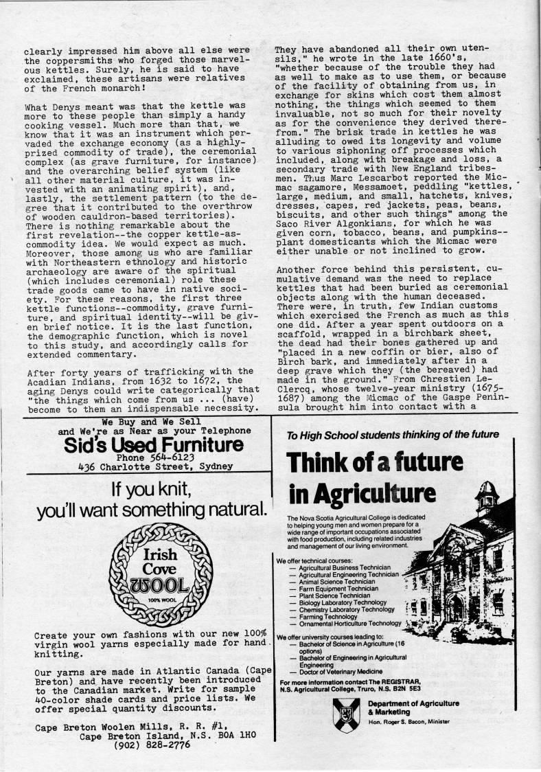 Published by Ronald Caplan on 1979/12/1 (396 reads)clearly impressed him above all else were the coppersmiths who forged those marvel? ous kettles. Surely, he is said to have exclaimed, these artisans were relatives of the French monarch! What Denys meant was that the kettle was more to these people than simply a handy cooking vessel. Much more than that, we know that it was an instrument which per? vaded the exchange economy (as a highly- prized commodity of trade), the ceremonial complex (as grave furniture, for instance) and the overarching belief system (like all other material culture, it was in? vested with an animating spirit), and, lastly, the settlement pattern (to the de? gree that it contributed to the overthrow of wooden cauldron-based territories). There is nothing remarkable about the first revelation • the copper kettle-as- commodity idea. We would expect as much. Moreover, those among us who are familiar with Northeastern ethnology and historic archaeology are aware of the spiritual (which includes ceremonial) role these trade goods came to have in native soci? ety. For these reasons, the first three kettle functions--commodity, grave furni? ture, and spiritual identity • will be giv? en brief notice. It is the last function, the demographic function, which is novel to this study, and accordingly calls for extended commentary. After forty years of trafficking with the Acadian Indians, from 1632 to I672, the aging Denys could write categorically that "the things which come from us ... (have) become to them an indispensable necessity. They have abandoned all their own uten? sils," he wrote in the late l660's, "whether because of the trouble they had as well to make as to use them, or because of the facility of obtaining from us, in exchange for skins which cost them almost nothing, the things which seemed to them invaluable, not so much for their novelty as for the convenience they derived there? from." The brisk trade in kettles he was alluding to owed its longevity and volume to various siphoning off processes which included, along with breakage and loss, a secondary trade with New England tribes? men. Thus Marc Lescarbot reported the Mic? mac sagamore, Messamoet, peddling "kettles, large, medium, and small, hatchets, knives, dresses, capes, red jackets, peas, beans, biscuits, and other such things" among the Saco River Algonkians, for which he was given corn, tobacco, beans, and pumpkins • plant domesticants which the Micmac were either unable or not inclined to grow. Another force behind this persistent, cu? mulative demand was the need to replace kettles that had been buried as ceremonial objects along with the human deceased. There were, in truth, few Indian customs which exercised the French as much as this one did. After a year spent outdoors on a scaffold, wrapped in a birchbark sheet, the dead had their bones gathered up and "placed in a new coffin or bier, also of Birch bark, and immediately after in a deep grave which they (the bereaved) had made in the ground." From Chrestien Le- Clercq, whose twelve-year ministry (I675- 1687) among the Micmac of the Gaspe Penin? sula brought him into contact with a We Buy and We Sell and We're as Near as your Telephone Sid's Used Furniture Phone 564-6123 436 Charlotte Street, Sydney If you knit, you'll want something natural. Create your own fashions with our new 100?' virgin wool yarns especially made for hand, knitting. Our yams are made in Atlantic Canada (Cape Breton) and have recently been introduced to the Canadian market. Write for sample 40-color shade cards and price lists. We offer special quantity discounts. Cape Breton Woolen Mills, R. R. #1, Cape Breton Island, N.S. BOA IHO (902) 828-2776 To High Scliool students tiiinldng of the future Think of a future in Agriculture The Nova Scotia Agricultural College is dedicated to helping young men and women prepare for a wide range of important occupations associated with food production, including related industries and management of our living environment. We offer technical courses: • Agricultural Business Technician • Agricultural Engineering Technician • Animal Science Technician • Farm Equipment Technician • Plant Science Technician • Biology Latwratory Technology -,, • Chemistry Laboratory Technology j- • Farming Technology • Ornamental Horticulture Technology 'y We offer university courses leading to: • Bachelor of Science in.Agriculture (16 options) • Bachelor of Engineering in Agricultural Engineering • Doctor of Veterinary Medicine For more information contact The REGISTRAR, N.S. Agricultural College, Truro, N.S. B2N 5E3 Department of Agriculture & Marketing Hor>. Rogers. Bacon, Minister