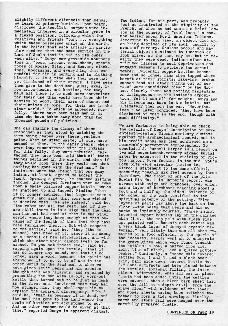Published by Ronald Caplan on 1979/12/1 (358 reads)slightly different clientele than Denys, we learn of primary burials. Upon death, disclosed the Recollet, corpses were im? mediately interred in a circular grave in a flexed position, following which the relatives and friends "bury ... everything which these possessed while on the earth, in the belief that each article in partic? ular renders them the same service in the Land of Souls that it did to its owner when alive." Denys saw graveside mourners toss in "bows, arrows, snow-shoes, spears, robes of Moose, Otter, and Beaver, stock? ings, moccasins, and everything that was needful for him in hunting and in clothing himself.... At a time when they were not yet disabused of their errors, I have seen them give to the dead man, guns, axes, i- ron arrow-heads, and kettles, for they held all these to be much more convenient for their use than would have been their Settles of wood, their axes of stone, and their knives of bone, for their use in the Dther world." To which he appended, r'ue- fully, "there have been dead men in my time who have taken away more than two thousand pounds of peltries." One can imagine the dismay of these Frenchmen as they stood by watching the iirt being heaped over these precious pelts. What an utter waste, it must have seemed to them. In the early years, when? ever they remonstrated with the Indians for this folly, they were rebuffed, "al? though they have been told that all these things perished in the earth, and that if they would look there they would see that nothing had gone with the dead man." So insistent were the French that one gamy Indian, at least, agreed to accept the taunt. Opening a grave, he started sifting through the decayed furniture when he came upon a badly oxidized copper kettle, which he snatched up and tapped. Finding "that it no longer sounded, (he) began to make a great cry, and said that some one wished to deceive them. 'We see indeed,' said he, 'the robes and all the rest, and if they are still there it is a sign that the dead man has not had need of them in the other world, where they have enough of them be? cause of the length of time that they have been furnished them.... But with respect to the kettle,' said he, 'they (the de? ceased) have need of it, since it is among us a utensil of new introduction, and with which the other world cannot (yet) be fur? nished. Do you not indeed see,' said he, rapping again upon the kettle, 'that it has no longer any sound, and that it no longer says a word, because its spirit has abandoned it to go to be of use in the other world to the dead man to whom we have given it?'" Denys and his cronies thought this was hilarous, and rejoined by presenting the man with an old, worn-out kettle that turned out to be just as dumb as the first one. Convinced that they had now stumped him, they challenged him to explain the apparent discrepancy. "'Ha,' said he, 'that is because it is dead, and its soul has gone to the land where the souls of kettles are accustomed to go.' And no other reason could be given at that time," reported Denys in apparent disgust. The Indian, for his part, was probably just as frustrated at the stupidity of the French, on whom he had wasted a brief les? son in the concept of "soul loss," a com? mon belief among North Americaxi Indians. According to this view, an object died up? on being deprived of its soul, usually by means of sorcery. Souless people and ma? terial objects continued to function or look alive, as the case may be, but in re? ality they were dead. Indians often at? tributed illness to soul deprivation and engaged shamans to retrieve the errant member. Evidently copper kettles became dumb and no longer rang when tapped where bereft of their spirits; likewise, broken canoes "and all other things out of ser? vice" were considered "dead" by the Mic? mac. Clearly there was nothing misleading or disingenuous in the Indian's exposi-- tion. Yet it was all for naught. Denys and his friends may have lost a battle, but ultimately they won the war. "Neverthe? less," he later confided, "they have been disabused of that in the end, though with much difficulty." We are fortunate in being able to check the details of Denys' description of sev? enteenth-century Micmac mortuary customs against the archaeological record, and to his credit Denys has been confirmed as a remarkably perceptive ethnographer. So concluded J. Russell Harper in a report on two mid-seventeenth-century Micmac burial sites he excavated in the vicinity of Pic? tou Harbor, Nova Scotia, in the mid 1950's. Both pits were circular (notice Le- Clercq's statement to the same effect), measuring roughly six feet across by three feet deep. The floor of one of the pits. Burial Pit No. 1 in Harper's report, was strewn with twigs and branches, over which was a layer of birchbark reaching about a foot and a half up the sides. Evidence of red ocher on the bark testified to the spiritual potency of the setting. "Five layers of pelts lay above the bark on the floor" • the pelts that Denys and his co? horts so impiously mourned. "Three intact inverted copper kettles lay on the painted skin (i.e., the top pelt with flesh side up, painted red). Beneath each kettle was a very black layer of decayed organic ma? terial." Very likely this was all that re? mained of a food offering to the spirit of the deceased. Harper went on to enumerate the grave gifts which were found beneath the kettles: a bow, a hafted iron axe, awls, bits of cloth, "and a glazed pottery beaker." Curiously, a "moose skin covered Kettles Nos. 1 and 3, and a black bear skin, hair side down, covered Kettle No. 2." Some artifacts had been placed between the kettles, somewhat filling the inter? stices. Afterwards, when all was in place, "earth had been added until the kettles were covered, then a birch bark sheet laid over the fill at a depth of-1'' from the grave floor" with evidence of the lower and upper sheets having bee