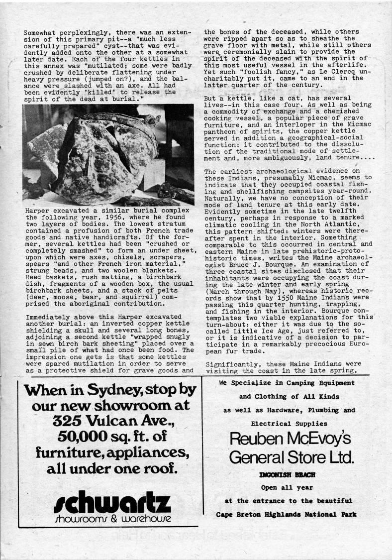 Published by Ronald Caplan on 1979/12/1 (341 reads)Somewhat perplexingly, there was an exten? sion of this primary pit • a "much less carefully prepared" cyst • that was evi? dently added onto the other at a somewhat later date. Each of the four kettles in this annex was "mutilated; some were badly crushed by deliberate flattening under heavy pressure (jumped on?), and the bal? ance were slashed with an axe. All had been evidently 'killed' to release the spirit of the dead at burial." Harper excavated a similar burial complex the following year, 1956, where he found two layers of bodies. The lowest stratum contained a profusion of both French trade goods and native handicrafts. Of the for? mer, several kettles had been "crushed or completely smashed" to form an under sheet, upon which were axes, chisels, scrapers, spears "and other French iron material," strung beads, and two woolen blankets. Reed baskets, rush matting, a birchbark dish, fragments of a wooden box, the usual birchbark sheets, and a stack of pelts (deer, moose, bear, and squirrel) com? prised the aboriginal contribution. Immediately above this Harper excavated another burial: an inverted copper kettle shielding a skull and several long bones, adjoining a second kettle "wrapped snugly in sewn birch bark sheeting" placed over a small pile of what had once been food. The impression one gets is that some kettles were spared mutilation in order to serve as a protective shield for grave goods and the bones of the deceased, while others were ripped apart so as to sheathe the grave floor with metal, while still others were, ceremonially slain to provide the spirit of the deceased With the spirit of this most useful vessel in the afterlife. Yet such "foolish fancy," as Le Clercq un? charitably put it, came to an end in the latt.er quarter of the century. But a kettle, like a cat, has several lives • in this case four. As well as being a commodity of exchange and a cherished cooking vessel, a popular piece of grave furniture, and an interloper in the Micmac pantheon of spirits, the copper kettle served in addition a geographical-social function: it contributed to the dissolu? tion of the traditional mode of settle? ment and, more ambiguously, land tenure.... The earliest archaeological evidence on these Indians, presumably Micmac, seems to indicate that they occupied coastal fish? ing and shellfishing campsites year-round. Naturally, we have no conception of their mode of land tenure at this early date. Evidently sometime in the late twelfth century, perhaps in response to a marked climatic cooling in the North Atlantic, this pattern shifted: winters were there? after spent in the interior. Something comparable to this occurred in central and eastern Maine in late prehistoric-proto- historic times, writes the Maine archaeol? ogist Bruce J. Bourque. An examination of three coastal sites disclosed that their inhabitants were occupying the coast dur? ing the late winter and early spring (March through May), whereas historic rec? ords show that by 1550 Maine Indians were passing this quarter hunting, trapping, and fishing in the interior. Bourque con? templates two viable explanations for this turn-about: either it was due to the so- called Little Ice Age, just referred to, or it is indicative of a decision to par? ticipate in a remarkably precocious Euro? pean fur trade. Significantly, these Maine Indians were visiting the coast in the late spring. WKcn in Sydney, stop by our nev'r showroom at 525 Vulcan Ave., 50,000 sq.ft. of furniture, appliances, all under one roof. /dlUMMlZ /houuroom/ S uuorehou/e V4e Specaaj.ize in Camping Equipment and Clothing of All Kinds as well as Hardware, Plumbing and Electrical Supplies Reuben McEvoys General Store Ltd. JNQONISH VBMSR Open all year at the entrance to the beautiful Cape Breton HighlaiMls National Park