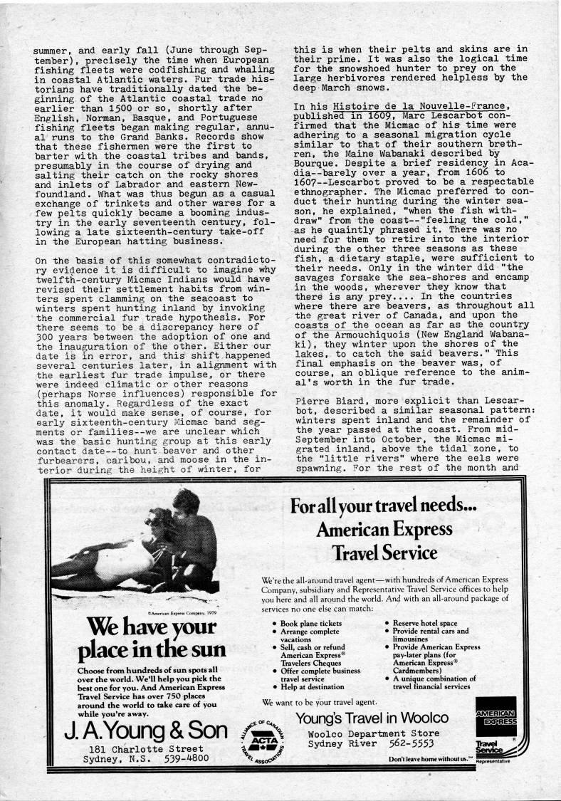 summer, and early fall (June through Sep? tember), precisely the time when European fishing fleets were codfishing and whaling in coastal Atlantic waters. Fur trade his? torians have traditionally dated the be? ginning of the Atlantic coastal trade no earlier than 15OO or so, shortly after English, Norman, Basque, and Portuguese fishing fleets began making regular, annu? al runs to the Grand Banks. Records show that these fishermen were the first to barter with the coastal tribes and bands, presumably in the course of drying and salting their catch on the rocky shores and inlets of Labrador and eastern New? foundland. What was thus begun as a casual exchange of trinkets and other wares for a few pelts quickly became a booming indus? try in the early seventeenth century, fol? lowing a late sixteenth-century take-off in the European hatting business. On the basis of this somewhat contradicto? ry evidence it is difficult to imagine why twelfth-century Micmac Indians would have revised their settlement habits from win? ters spent clamming on the seacoast to winters spent hunting inland by invoking the commercial fur trade hypothesis. For there seems to be a discrepancy here of 300 years between the adoption of one and the inauguration of the other. Either our date is in error, and this shift happened several centuries later, in alignment with the earliest fur trade impulse, or there were indeed climatic or other reasons (perhaps Norse influences) responsible for this anomaly. Regardless of the exact date, it would make sense, of course, for early sixteenth-century ?4icraac band seg? ments or families--we are unclear which was the basic hunting group at this early contact date • to hunt beaver and other furbearers, caribou, and moose in the in? terior during the height of winter, for this is when their pelts and skins are in their prime. It was also the logical time for the snowshoed hunter to prey on the large herbivores rendered helpless by the deep March snows. In his Histoire de la Nouvelle-France, published in 1609, Marc Lescarbot con- firmed that the Micmac of his time were adhering to a seasonal migration cycle similar to that of their southern breth? ren, the Maine Wabanaki described by Bourque. Despite a brief residency in Aca? dia • barely over a year, from I6O0 to 1607 • Lescarbot proved to be a respectable ethnographer. The Micmac preferred to con? duct their hunting during the winter sea? son, he explained, "when the fish with? draw" from the coast • "feeling the cold," as he quaintly phrased it. There was no need for them to retire into the interior during the other three seasons as these fish, a dietary staple, were sufficient to their needs. Only in the winter did "the savages forsake the sea-shores and encamp in the woods, wherever they know that there is any prey.... In the countries where there are beavers, as throughout all the great river of Canada, and upon the coasts' of the ocean as far as the country of the Armouchiquois (New England Wabana? ki), they winter upon the shores of the lakes, to catch the said beavers." This final emphasis on the beaver was, of course, an oblique reference to the anim? al's worth in the fur trade. Pierre Biard, more explicit than Lescar? bot, described a similar seasonal pattern: winters spent inland and the remainder of the year passed at the coast. From mid- September into October, the Micmac mi? grated inland, above the tidal zone, to the "little rivers" where the eels were spawning. For the rest of the month and "' have your place in the sun Choose from hundreds of sun spots all over the world. We'll help you pick the best one for you. And American Express Travel Service has over 750 places around the world to take care of you while you're away. J.A.Young&Son; /J 181 Charlotte Street Sydney, N.S. 539-'800 For all your travel needs.. American Express Travel Service We're the all-around travel agent • with hundreds of American Express Company, subsidiary and Representative Travel Service offices to help you here and all around the world. And with an all-around package of i else can match: services no c • Book plane tickets • Arrange complete vacations • Sell, cash or refund American Express? Travelers Cheques • Offer complete business travel service • Help at destination • Reserve hotel space • Provide rental cars and limousines • Provide American Express pay-later plans (for American Express? Cardmembers) • A unique combination of travel financial services We want to be your travel agent. .0,' Young's Travel in Woolco -J5' Woolco Department Store ??Sm- Sydney River 562-5553 ' As%