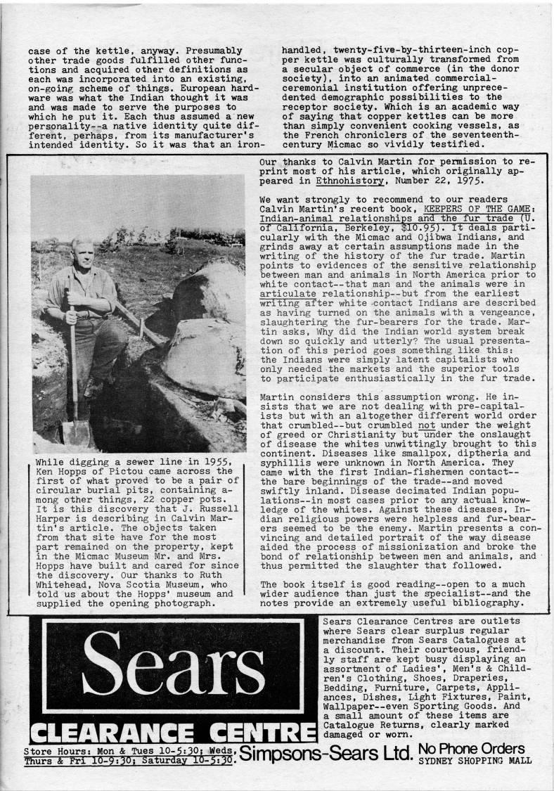 Published by Ronald Caplan on 1979/12/1 (296 reads)case of the kettle, anyway. Presumably other trade goods fulfilled other func? tions and acquired other definitions as each was incorporated into an existing, on-going scheme of things. European hard? ware was what the Indian thought it was and was made to serve the purposes to which he put it. Each thus assumed a new personality--a native identity quite dif? ferent, perhaps, from its manufacturer's intended identity. So it was that an iron- handled, twenty-five-by-thirteen-inch cop? per kettle was culturally transformed from a secular object of commerce (in the donor society), into an animated commercial- ceremonial institution offering unprece? dented demographic possibilities to the receptor society. Which is an academic way of saying that copper kettles can be more than simply convenient cooking vessels, as the French chroniclers of the seventeenth- century Micmac so vividly testified. While digging a sewer line in 1955, Ken Hopps of Pictou came across the first of what proved to be a pair of circular burial pits, containing a- mong other things, 22 copper pots. It is this discovery that J. Russell Harper is describing in Calvin Mar? tin's article. The objects taken from that site have for the most part remained on the property, kept in the Micmac Museum Mr. and Mrs. Hopps have built and cared for since the discovery. Our thanks to Ruth Whitehead, Nova Scotia Museum, who told us about the Hopps' museum and supplied the opening photograph. Our thanks to Calvin Martin for permission to re? print most of his article, which originally ap? peared in Ethnohistory, Number 22, 1975. We want strongly to recommend to our readers Calvin Martin's recent book, KEEPERS OF THE GAME: Indian-animal relationships and the fur trade (U. of California, Berkeley, $10.95). It deals parti- cularly with the Micmac and Ojibwa Indians, and grinds away at certain assumptions made in the writing of the history of the fur trade. Martin points to evidences of the sensitive relationship between man and animals in North America prior to white contact • that man and the animals were in articulate relationship • but from the earliest writing after white contact Indians are described as having turned on the animals with a vengeance, slaughtering the fur-bearers for the trade. Mar? tin asks. Why did the Indian world system break down so quickly and utterly? The usual presenta? tion of this period goes something like this: the Indians were simply latent capitalists who only needed the markets and the superior tools to participate enthusiastically in the fur trade. Martin considers this assumption wrong. He in? sists that we are not dealing with pre-capital- ists but with an altogether different world order that crumbled • but crumbled not under the weight of greed or Christianity but under the onslaught of disease the whites unwittingly brought to this continent. Diseases like smallpox, diptheria and syphillis were unknown in North America. They came with the first Indian-fishermen contact • the bare beginnings of the trade • and moved swiftly inland. Disease decimated Indian popu- lations--in most cases prior to any actual know? ledge of the whites. Against these diseases, In? dian religious powers were helpless and fur-bear? ers seemed to be the enemy. Martin presents a con? vincing and detailed portrait of the way disease aided the process of missionization and broke the bond of relationship between men and animals, and thus permitted the slaughter that followed. The book itself is good reading • open to a much wider audience than just the specialist • and the notes provide an extremely useful bibliography. Sears Clearance Centres are outlets where Sears clear surplus regular merchandise from Sears Catalogues at a discount. Their courteous, friend? ly staff are kept busy displaying an assortment of Ladies', Men's & Child? ren's Clothing, Shoes, Draperies, Bedding, Furniture, Carpets, Appli? ances, Dishes, Light Fixtures, Paint, Wallpaper • even Sporting Goods. And a small amount of these items are Catalogue Returns, clearly marked damaged or worn. Store Hours; Thurs & Fri : Mon & Tues io-5:3p; Weds. Slmn'inrm-fif'r'' L tfl No Phone Orders 10-':30; Saturday 10-5:30. '" ?? iP''i lO OtJdl C> L.IU. SYDNEY SHOPPING MAL