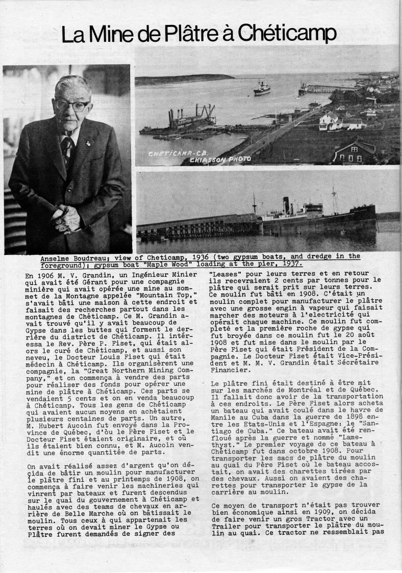 Published by Ronald Caplan on 1979/12/1 (550 reads)La Mine de Platre a Cheticamp Anselme Boudreau; view of Cheticamp, 1936 (two gypsum boats, and dredge in the foreground); gypsum boat "Maple Wood" loading ax xhe pier, 1937? En 1906 M. V. Grandin, un Ingenieur Minier qui avait ete G6rant pour une compagnie minidre qui avait oper6e une mine au som- met de la Montagne appelee "Mountain Top," s'avait bati une maison a cette endroit et faisait des recherches part'out dans les montagnes de Cheticamp. Ce M. Grandin a- vait trouve qu'il y avait beaucoup de Gypse dans les buttes qui ferment le der- ridre du district de Cheticamp. II inter- essa le Rev. Pere'P. Fiset, qui etait al- ors le cure de Cheticamp, et aussi son neveu, le Docteur Louis Fiset qui etait medecin a Cheticamp. lis organiserent une compagnie, la "Great Northern Mining Com? pany," et on commen9a a vendre des parts pour realiser des fonds pour operer une mine de platre a Cheticamp. Ces parts se vendaient 5 cents et on en venda'beaucoup a Cheticamp. Tous les gens de Cheticamp qui avaient aucun moyens en achetaient plusieurs centaines de parts. Un autre, M. Hubert Aucoin fut envoye dans la Pro? vince de Quebec, d'ou le Pere Fiset et'le Docteur Fiset etaient originaire, et ou ils 6taient bien connu, et M. Aucoin ven- dit une enorme quantitee de parts. On avait realist assez d'argent qu'on de- cida de batir un moulin pour manufacturer le platre fini et au printemps de 1908, on commenca a faire venir les machineries qui vinrent par bateaux et furent descendus sur le quai du gouvernement a Cheticamp et haules avec des teams de chevaux en ar? riere de Belle Marche ou on batissait le moulin. Tous ceux a qui appartenait les terres ou on devait miner le Gypse ou Platre furent demandes de signer des "Leases" pour leurs terres et en retour ils recevraient 2 cents par tonnes pour le platre qui serait prit sur leurs terres. Ce moulin fut bati en 1908. C'etait un moulin complet pour manufacturer le platre avec une grosse engin k vapeur qui'faisait marcher des moteurs a 1'electricite qui operait chaque machine. Ce moulin fut com? plete et la premi??re roche de gypse qui fut broyee dans ce moulin fut le 20 aout 19O8 et fut mise dans le moulin par le Pere Fiset qui etait President de la Com? pagnie. Le Docteur Fiset etait Vice-Presi? dent et M. M. V. Grandin etait Secretaire Finsincier. Le platre fini etait destine a etre mit sur les marches de Montreal et de Quebec. II fallait done avoir de la transportation a ces endroits. Le Pere Fiset alors acheta un bateau qui avait coule dans le havre de Manile au Cuba dans la guerre de I898 en? tre les Etats-Unis et I'Espagne:'le "San? tiago de Cuba." Ce bateau avait ete ren- floue apres la guerre et nomme "Lame- th'st." Le premier voyage de ce bateau a Cheticamp fut dans octobre 1908. Pour transporter les sacs de platre du moulin au quai du Pere Fiset ou le bateau accos- tait, on avait des charettes tirees par des chevaux. Aussi on avaient des cha? rettes pour transporter le gypse de la carriere au moulin. Ce mojren de transport n'etait pas trouver bien economique ainsi en I909, on decida de faire venir un gros Tractor'avec un Trailer pour transporter le platre du mou? lin au quai. Ce tractor ne ressemblait pas