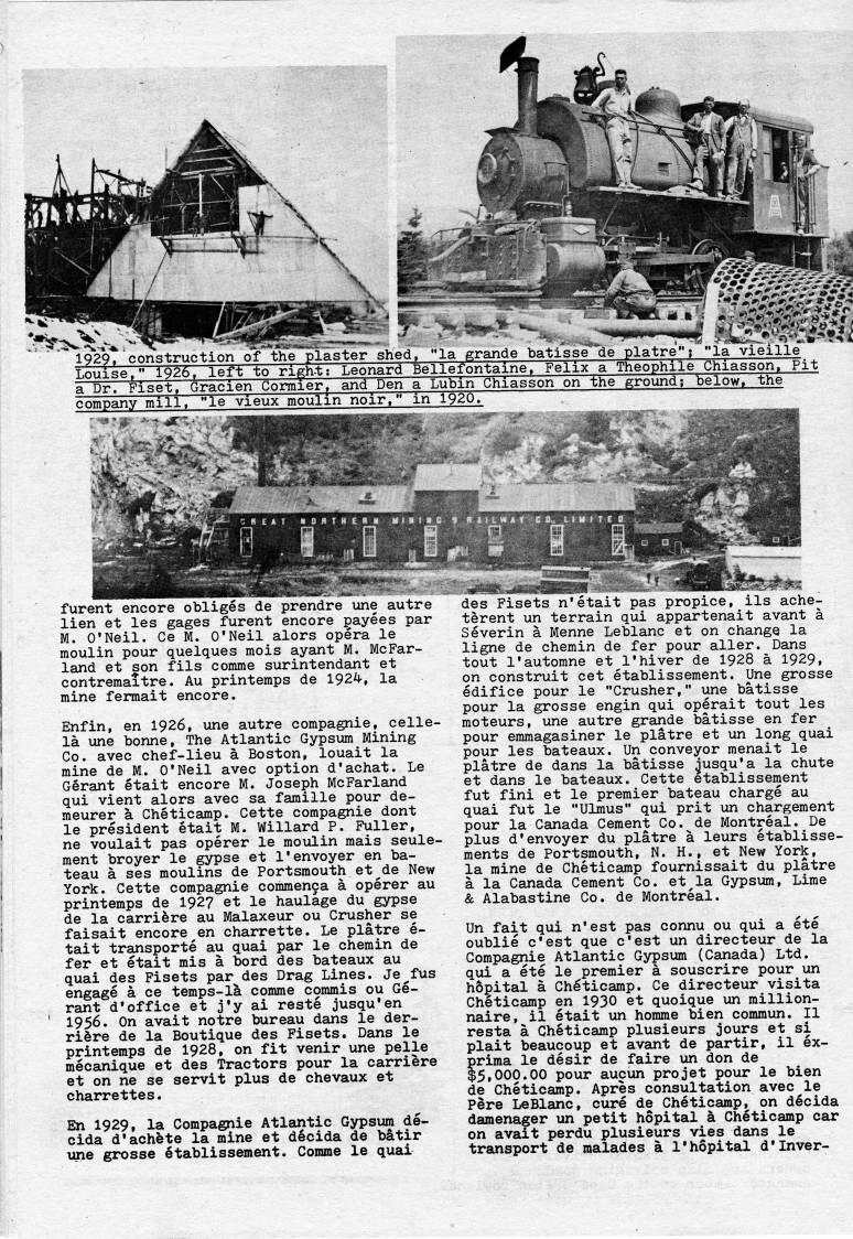 Published by Ronald Caplan on 1979/12/1 (371 reads)1929, construction of the plaster shed, "la grande batisse'de platre"; "la vieille Louise,'' 1926, left to right; Leonard Beliefontaine, Felix a Theophile Chiasson. Pit a Dr. Fiset, Gracien Cormier, and Den a Lubm Chiasson on the ground; below, the company mill, "le vieux moulm noir," in 1920. furent encore obliges de prendre une autre lien et les gages furent encore payees par M. O'Neil. Ce M. O'Neil alors opera le moulin pour quelques mois ayant M. McFar? land et son fils comme surintendant et contremaitre. Au printemps de 1924, la mine fermait encore. Enfin, en 1926, une autre compagnie, celle- la une bonne. The Atlantic Gypsum Mining Co. avec chef-lieu a Boston, louait la mine de M. O'Neil avec option d'achat. Le Gerant etait encore M. Joseph McFarland qui vient alors avec sa famille pour de- meurer a Cheticamp. Cette compagnie dont le president etait M. Willard P. Fuller, ne voulait pas operer le moulin mais seule- ment broyer le gypse et I'envoyer en ba? teau a ses moulins de Portsmouth etde New York. Cette compagnie commenca a operer au printemps de 1927 et le haulage du gypse de la carriere au Malaxeur ou Crusher se faisait encore en charrette. Le platre e- tait transporte au quai par le chemin de fer et etait mis a bord des bateaux au quai des Fisets par des Drag Lines. Je'fus engage a ce temps-la comme coramis ou Ge? rant d'office et j'y ai reste jusqu'en 1956. On avait notre bureau dans le der- rilre de la Boutique des Fisets. Dans le printemps de 1928, on fit venir une pelle mecanique et des Tractors pour la carriere et on ne se servit plus de chevaux et charrettes. En 1929. la Compagnie Atlantic Gypsum de? cida d'achete la mine et decida de batir ime grosse etablissement. Comme le quai des Fisets n'etait pas propice, ils ache- terent un terrain qui appartenait avant a Severin a Menne Leblanc et on change la ligne de chemin de fer pour aller. Dans tout I'automne et I'hiver de 1928 a 1929, on construit cet etablissement. Une grosse edifice pour le "Crusher," une batisse pour la grosse engin qui operait tout les moteurs, une autre grande batisse en fer pour emraagasiner le platre et un long quai pour les bateaux. Un conveyor menait le platre de dans la batisse jusqu'a la chute et dans le bateaux. Cette etablissement fut fini et le premier bateau charge au quai fut le "Ulmus" qui prit un chargement pour la Canada Cement Co. de Montreal. De plus d'envoyer du platre a leurs etablisse- ments de Portsmouth, N. H., et New York, la mine de Cheticamp fournissait du platre a la Canada Cement Co. et'la Gypsum, Lime & Alabastine Co. de Montreal. Un fait qui n'est pas connu ou qui a ete oublie c'est que c'est un directeur de la Compagnie Atlantic Gypsum (Canada) Ltd. qui a ete le premier a souscrire pour un hopital a Cheticamp. Ce directeur visita Cheticamp en 1930 et quoique un million- naire,'il etait un homme bien commun. II resta a Cheticamp plusieurs jours et si plait beaucoup et avant de partir, il ex- prima le desir de faire un don de $5f000.00 pour aucun projet pour le bien de Cheticamp. Apres consultation avec le Pere LeBlanc, cure de Cheticamp, on decida daraenager un petit hopital li Cheticamp car on avait perdu plusieurs vies dans le transport de malades a 1*hopital d'Inver-