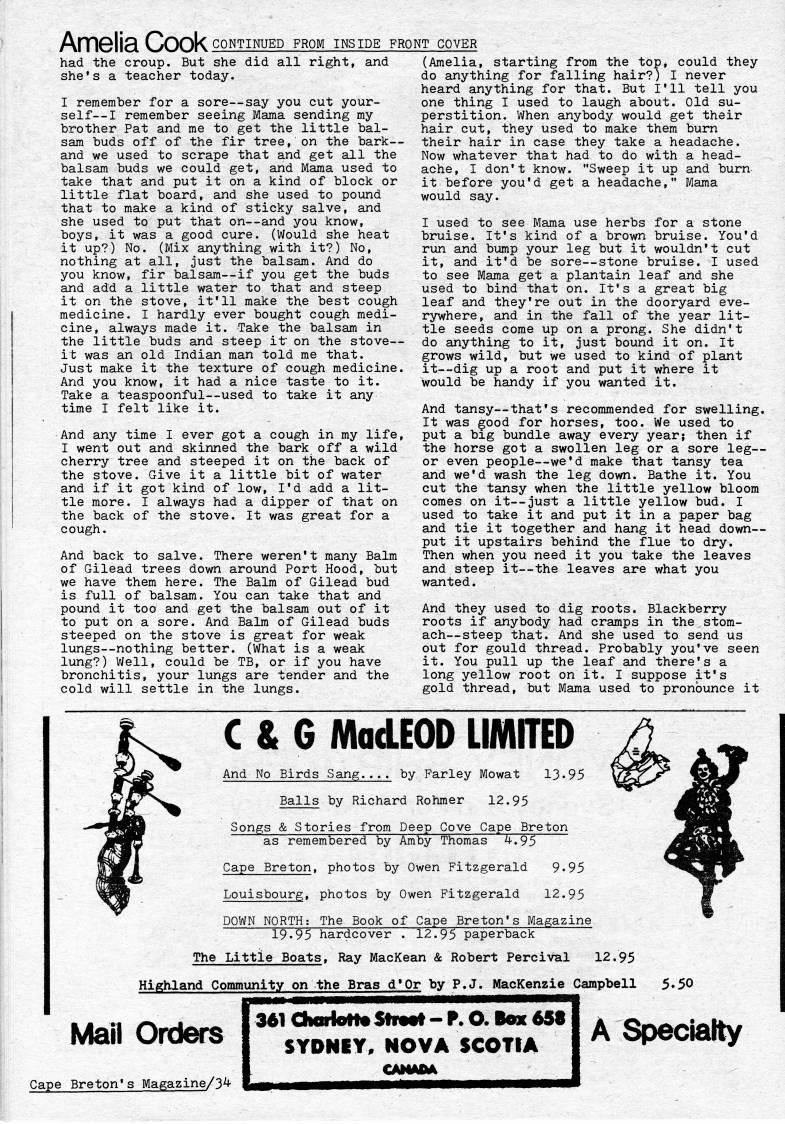 Published by Ronald Caplan on 1979/12/1 (327 reads)Amelia Cook CONTINUED FROM INSIDE FRONT COVER had the croup. But she did all right, she's a teacher today. and I remember for a sore • say you cut your? self • I remember seeing Mama sending my brother Pat and me to get the little bal? sam buds off of the fir tree, on the bark • and we used to scrape that and get all the balsam buds we could get, and Mama used to take that and put it on a kind of block or little flat board, and she used to pound that to make a kind of sticky salve, and she used to put that on • and you know, boys, it was a good cure. (Would she heat it up?) No. (Mix anything with it?) No, nothing at all, just the balsam. And do you know, fir balsam • if you get the buds and add a little water to that and steep it on the stove, it'll make the best cough medicine. I hardly ever bought cough medi? cine, always made it. Take the balsam in the little buds and steep it" on the stove • it was an old Indian man told me that. Just make it the texture of cough medicine. And you know, it had a nice taste to it. Take a teaspoonful • used to take it any time I felt like it. And any time I ever got a cough in my life, I went out and skinned the bark off a wild cherry tree and steeped it on the back of the stove. Give it a little bit of water and if it got kind of low, I'd add a lit? tle more. I always had a dipper of that on the back of the stove. It was great for a cough. And back to salve. There weren't many Balm of Gilead trees down around Port Hood, but we have them here. The Balm of Gilead bud is full of balsam. You can take that and pound it too and get the balsam out of it to put on a sore. And Balm of Gilead buds steeped on the stove is great for weak lungs • nothing better. (What is a weak lung?) Well, could be TB, or if you have bronchitis, your lungs are tender and the cold will settle in the lungs. (Amelia, starting from the top, could they do anything for falling hair?) I never heard anything for that. But I'll tell you one thing I used to laugh about. Old su? perstition. When anybody would get their hair cut, they used to make them burn their hair in case they take a headache. Now whatever that had to do with a head? ache, I don't know. "Sweep it up and burn, it before you'd get a headache," Mama would say. I used to see Mama use herbs for a stone bruise. It's kind of a brown bruise. You'd run and bump your leg but it wouldn't cut it, and it'd be sore • stone bruise. I used to see Mama get a plantain leaf and she used to bind that on. It's a great big leaf and they're out in the dooryard eve? rywhere, and in the fall of the year lit? tle seeds come up on a prong. She didn't do anything to it, just bound it on. It grows wild, but we used to kind of plant it • dig up a root and put it where it would be handy if you wanted it. And tansy • that's recommended for swelling. It was good for horses, too. We used to put a big bundle away every year; then if the horse got a swollen leg or a sore leg • or even people • we'd make that tansy tea and we'd wash the leg down. Bathe it. You cut the tansy when the little yellow bloom comes on it • just a little yellow bud. I used to take it and put it in a paper bag and tie it together and hang it head down • put it upstairs behind the flue to dry. Then when you need it you take the leaves and steep it • the leaves are what you wanted. And they used to dig roots. Blackberry roots if anybody had cramps in the stom? ach • steep that. And she used to send us out for gould thread. Probably you've seen it. You pull up the leaf and there's a long yellow root on it. I suppose it's gold thread, but Mama used to pronounce it C & G MadEOD LIMITB) And No Birds Sang by Farley Mowat 13.95 Balls by Richard Rohmer 12.95 Songs & Stories from Deep Cove Cape Breton as remembered by Amby Thomas '.95 ~ Cape Breton, photos by Owen Fitzgerald 9.95 Louisbourg, photos by Owen Fitzgerald 12.95 DOWN NORTH; The Book of Cape Breton's Magazine 19.95 hardcover . 12.95 paperback The Littie Boats, Ray MacKean & Robert Percival 12.95 Highland Community on the Bras d'Or by P.J. MacKenzie Campbell 5.50 '4aii Orders Cape Breton's Maga2ine/3' 361 Chorion* SirMt - P. O. Box 658 SYDNEY, NOVA SCOTIA A Specialty