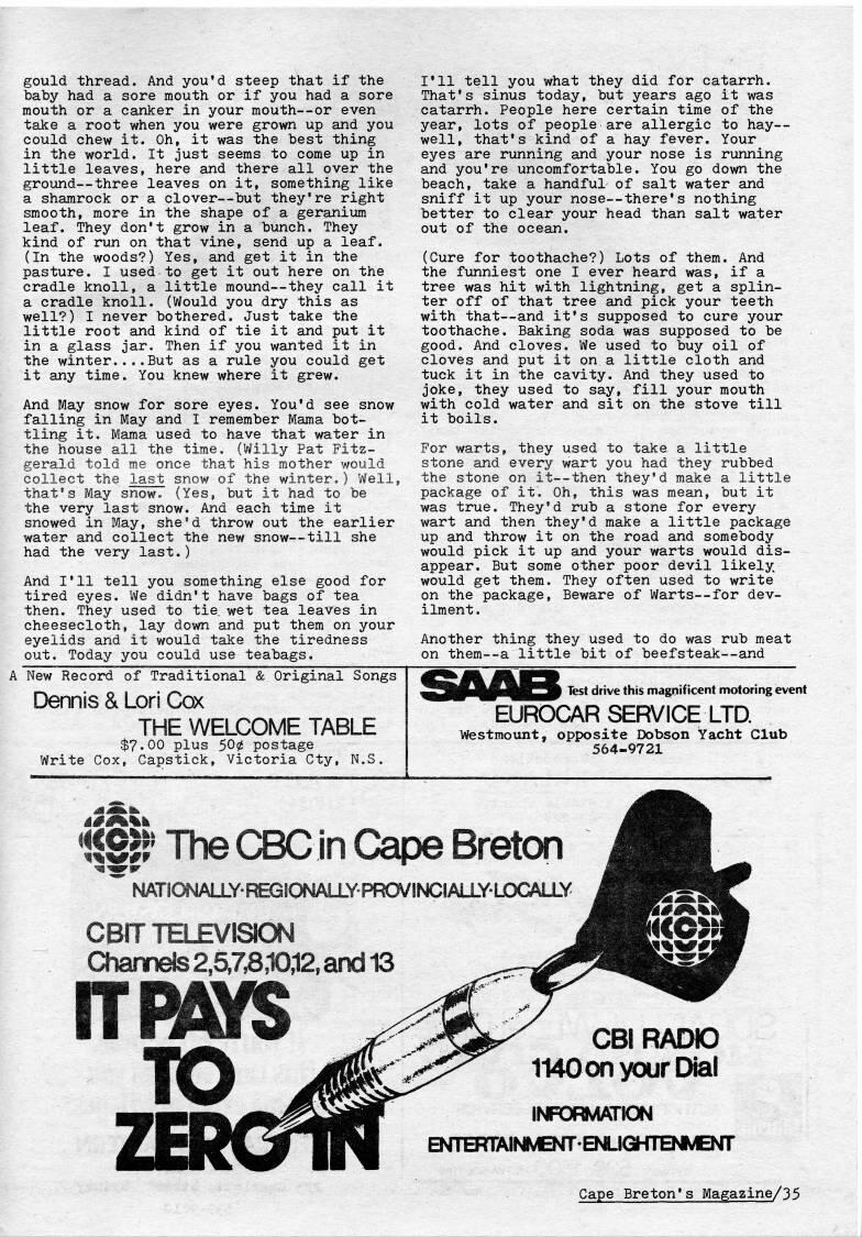 Published by Ronald Caplan on 1979/12/1 (282 reads)gould thread. And you'd steep that if the baby had a sore mouth or if you had a sore mouth or a canker in your mouth • or even take a root when you were grown up and you could chew it. Oh, it was the best thing in the world. It just seems to come up in little leaves, here and there all over the ground • three leaves on it, something like a shamrock or a clover • but they're right smooth, more in the shape of a geranium leaf. They don't grow in a bunch. They kind of run on that vine, send up a leaf. (In the woods?) Yes, and get it in the pasture. I used to get it out here on the cradle knoll, a little mound • they call it a cradle knoll. (Would you dry this as well?) I never bothered. Just take the little root and kind of tie it and put it in a glass jar. Then if you wanted it in the winter....But as a rule you could get it any time. You knew where it grew. And May snow for sore eyes. You'd see snow falling in May and I remember Mama bot? tling it. Mama used to have that water in the house all the time. (Willy Pat Fitz? gerald told me once that his mother would collect the last snow of the winter.) Well, that's May snow. (Yes, but it had to be the very last snow. And each time it snowed in May, she'd throw out the earlier water and collect the new snow • till she had the very last.) And I'll tell you something else good for tired eyes. We didn't have bags of tea then. They used to tie wet tea leaves in cheesecloth, lay down and put them on your eyelids and it would take the tiredness out. Today you could use teabags. I'll tell you what they did for catarrh. That's sinus today, but years ago it was catarrh. People here certain time of the year, lots of people are allergic to hay • well, that's kind of a hay fever. Your eyes are running and your nose is running and you're uncomfortable. You go down the beach, take a handful of salt water and sniff it up your nose • there's nothing better to clear your head than salt water out of the ocean. (Cure for toothache?) Lots of them. And the funniest one I ever heard was, if a tree was hit with lightning, get a splin? ter off of that tree and pick your teeth with that • and it's supposed to cure your toothache. Baking soda was supposed to be good. And cloves. We used to buy oil of cloves and put it on a little cloth and tuck it in the cavity. And they used to joke, they used to say, fill your mouth with cold water and sit on the stove till it boils. For warts, they used to take a little stone and every wart you had they rubbed the stone on it • then they'd make a little package of it. Oh, this was mean, but it was true. They'd rub a stone for every wart and then they'd make a little package up and throw it on the road and somebody- would pick it up and your warts would dis? appear. But some other poor devil likely would get them. They often used to write on the package, Beware of Warts • for dev? ilment. Another thing they used to do was rub meat on them • a little bit of beefsteak • and A New Record of Traditional & Original Songs Dennis & Lori Cox THE WELCOME TABLE $7.00 plus 50(' postage Write Cox, Capstick, Victoria Cty, N.S. Test drive this magnificent motoring event EUROCAR SERVICE LTD. Westmount, opposite Dobson Yacht Club 564-9721 1JS8' The CBC in Cape Breton " NATIONAUyFB3IONAIXYPre>/II'IAIXY-LOCALLY CBTT TELEVISION Channels 2,5'73,10,12, and 13 rrmrs CBI RADIO 1140 on your Dial l'f=ORMATION BnEFn-AINMB'TEha-IGHTENMEMT Cape Breton's Maga2ine/35