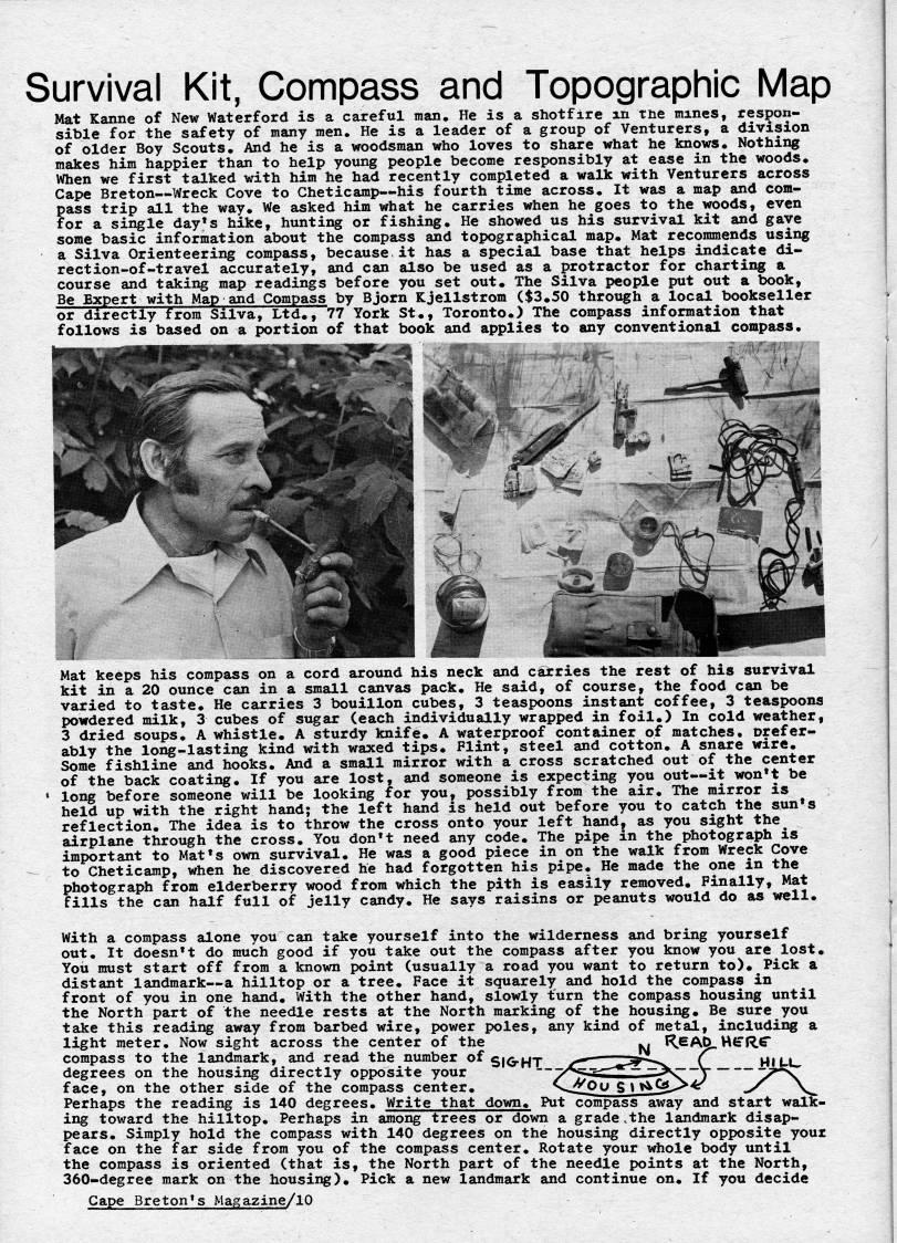 Published by Ronald Caplan on 1973/5/1 (4761 reads)Survival Kit, Compass and Topographic Map Mat Kanne of New Waterford is a careful man. He is a shotfire m tne mines, respon? sible for the safety of many men. He is a leader of a group of Venturers, a division of older Boy Scouts. And he is a woodsman who loves to share what he knows. Nothing makes him happier than to help young people become responsibly at ease in the woods. When we first talked with him he had recently completed a walk with Venturers across Cape Breton • Wreck Cove to Cheticamp • his fourth time across. It was a map and com? pass trip all the way. We asked him what he carries when he goes to the woods, even for a single day's hike, hunting or fishing. He showed us his survival kit and gave some basic information about the compass and topographical map. Mat recommends using a Silva Orienteering compass, because-it has a special base that helps indicate di? rect ion-of -travel accurately, and can also be used as a protractor for charting a course and taking map readings before you set out. The Silva people put out a book. Be Expert with Map'and Compass by Bjorn Kjellstrom ($3.50 through a local bookseller or directly from Silva, Ltd., 77 York St., Toronto.) The compass information that follows is based on a portion of that book and applies to any conventional compass. Mat keeps his compass on a cord around his neck and carries the rest of his survival kit in a 20 ounce can in a small canvas pack. He said, of course, the food can be varied to taste. He carries 3 bouillon cubes, 3 teaspoons instant coffee, 3 teaspoons powdered milk, 3 cubes of sugar (each individually wrapped in foil.) In cold weather, 3 dried soups. A whistle. A sturdy knife. A waterproof container of matches, prefer? ably the long-lasting kind with waxed tips. Flint, steel and cotton. A snare wire. Some fishline and hooks. And a small mirror with a cross scratched out of the center of the back coating. If you are lost, and someone is expecting you out • it won't be long before someone will be looking for you, possibly from the air. The mirror is held up with the right hand; the left hand is held out before you to catch the sun's reflection. The idea is to throw the cross onto your left hand, as you sight the airplane through the cross. You don't need any code. The pipe m the photograph is important to Mat's own survival. He was a good piece in on the walk from Wreck Cove to Cheticamp, when he discovered he had forgotten his pipe. He made the one in the photograph from elderberry wood from which the pith is easily removed. Finally, Mat fills the can half full of jelly candy. He says raisins or peanuts would do as well. With a compass alone you can take yourself into the wilderness and bring yourself out. It doesn't do much good if you take out the compass after you know you are lost. You must start off from a known point (usually a road you want to return to). Pick a distant landmark • a hilltop or a tree. Face it squarely and hold the compass in front of you in one hand. With the other hand, slowly turn the compass housing until the North part of the needle rests at the North marking of the housing. Be sure you take this reading away from barbed wire, power poles, any kind of metal, including a light meter. Now sight across the center of the READ HtsRC compass to the landmark, and read the number of c,c.ut > • 'J' ( degrees on the housing directly opposite your ---y'-?'-*''--' • -v zM ' face, on the other side of the compass center. C'Ou S t'<''' '/' . Perhaps the reading is 140 degrees. Write that down. Put compass away and start walk? ing toward the hilltop. Perhaps in among trees or down a grade.the landmark disap? pears. Simply hold the compass with 140 degrees on the housing directly opposite your face on the far side from you of the compass center. Rotate your whole body until the compass is oriented (that is, the North part of the needle points at the North, 360-degree mark on the housing). Pick a new landmark and continue on. If you decide Cape Breton's Magazine/10